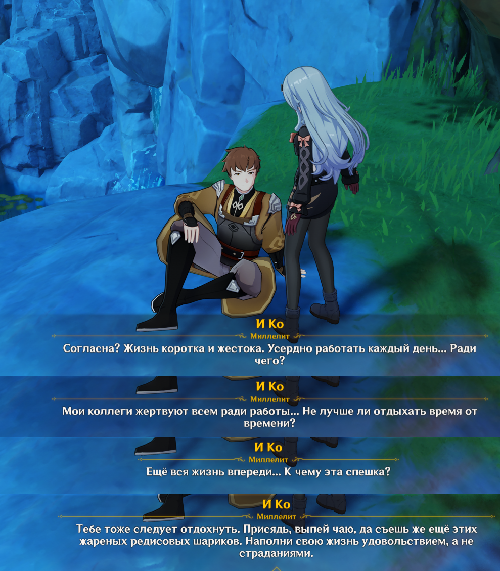 диалоги в геншине это пиздец пытка, я в игру зашел поиграть пробовал ззз, сама игра не понравилась но скип диалогов местами прям охуенен. типа ты и так знаешь по первым строчкам о чем диалог будет, и не надо читать эту хуйню типа ПРИВЕТ ГГ ОЙ КАК ДАВНО НЕ ВИДЕЛИСЬ КСТАТИ ЕСТЬ ПОРУЧЕНИЕ ВОТ ДА....