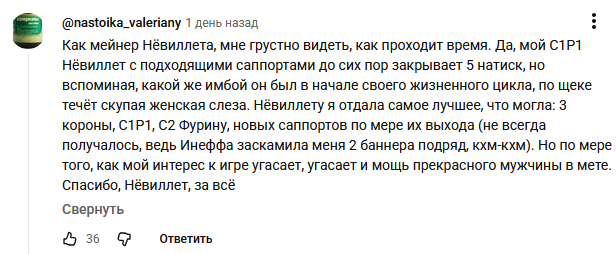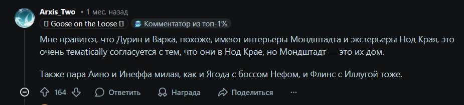>А, ну и играбельными перчиками Сненой будут не Фатуи, а какие-то случайные снежевички уровня бармена, психолога, повара и прочих важных для сюжета (нет) архетипов. Больший провал для истории был бы сделать всех предвестников играбельными. Так есть хоть какая-то интрига, кто в итоге останется, а кто помрёт. Лично я в ахуе сидел когда Синьору и Капитано ёбнули окончательно. Редкий вин.