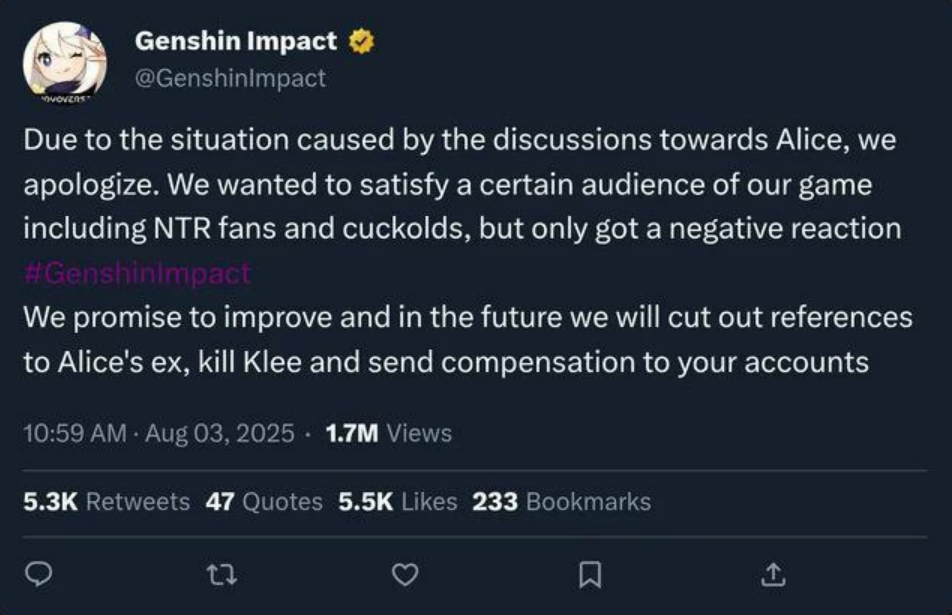 >>6470345 В ВНках кнопка сейва есть на любом моменте. В геншине ты ожидаешь хотя бы сейв на выходе из диалога, но это слишком сложно для проекта Г в 2026 году, года через 3-4 сделают