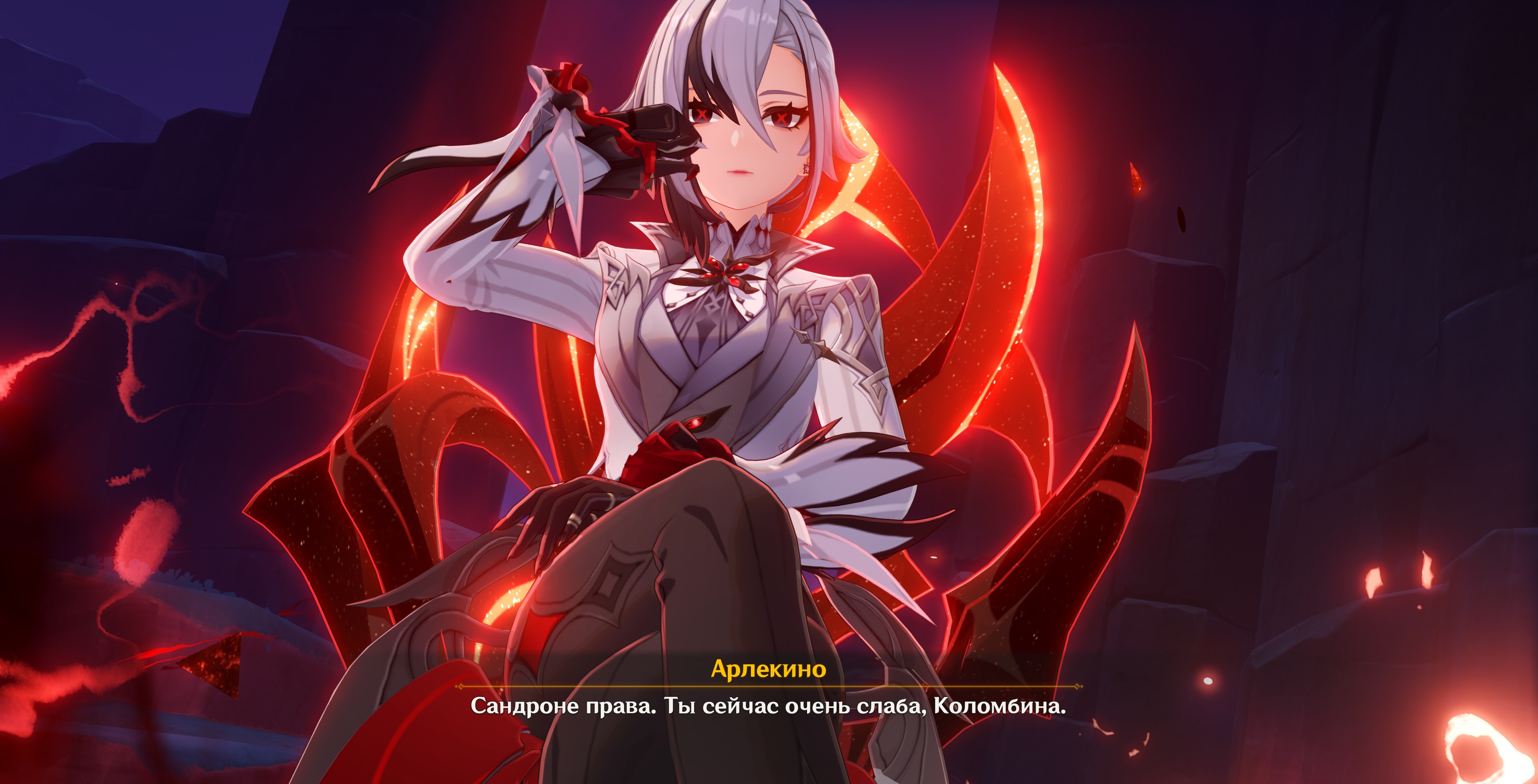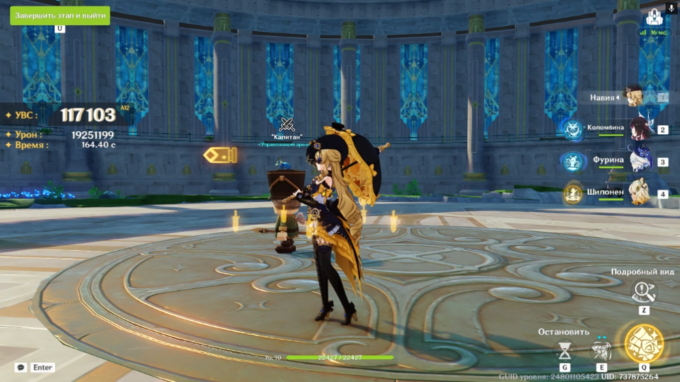 Второй босс уже начал душить. У меня все кроме одного героя на аккаунте очень плохо одеты. Без сильного саппорта Арля не справлялась. Да и щит я ломал что-то через раз. Если больше электро и гидро добавлять, то Арлекино уже не дамажит. Другими составами не мог там пройти.