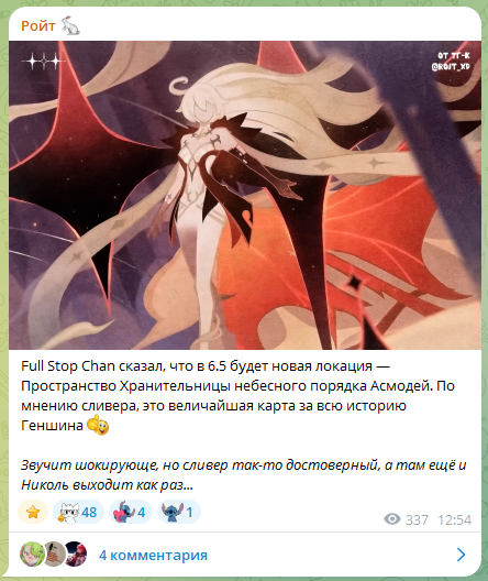 >>6469308 > Антисейм, жду патча сильнее, чем получку. Уже предвкушаю, как завтра встану чуть свет и мощнейшим образом покручу долгожданные мондштадские хроники, как сюжетку Варки занюхаю, пойду в чайник комплекты делать нод-крайские, в милиастру ещё надо будет зайти и оформить додеп на скидочную десяточку в надежде получить лягушачий костюм. Лютый завоз завтра будет, это просто охуенно.