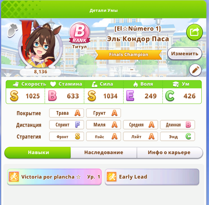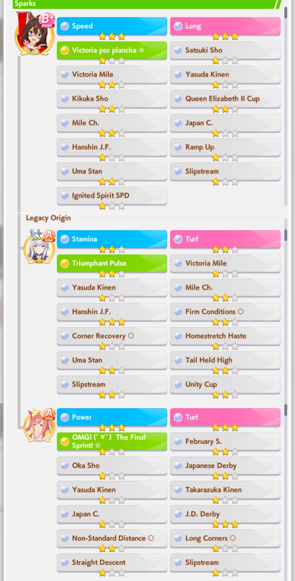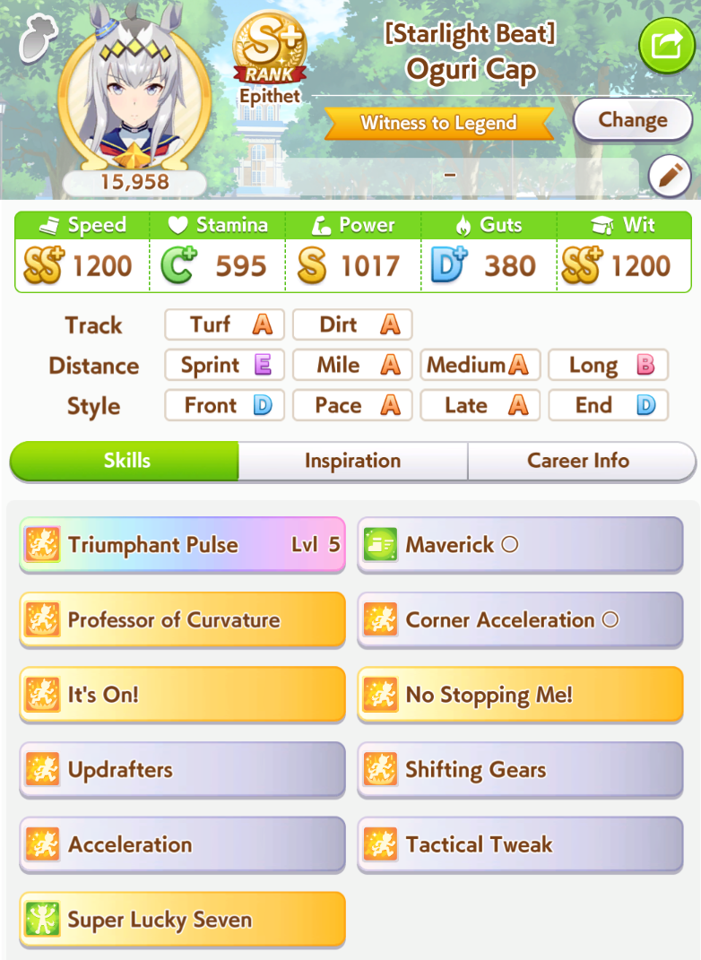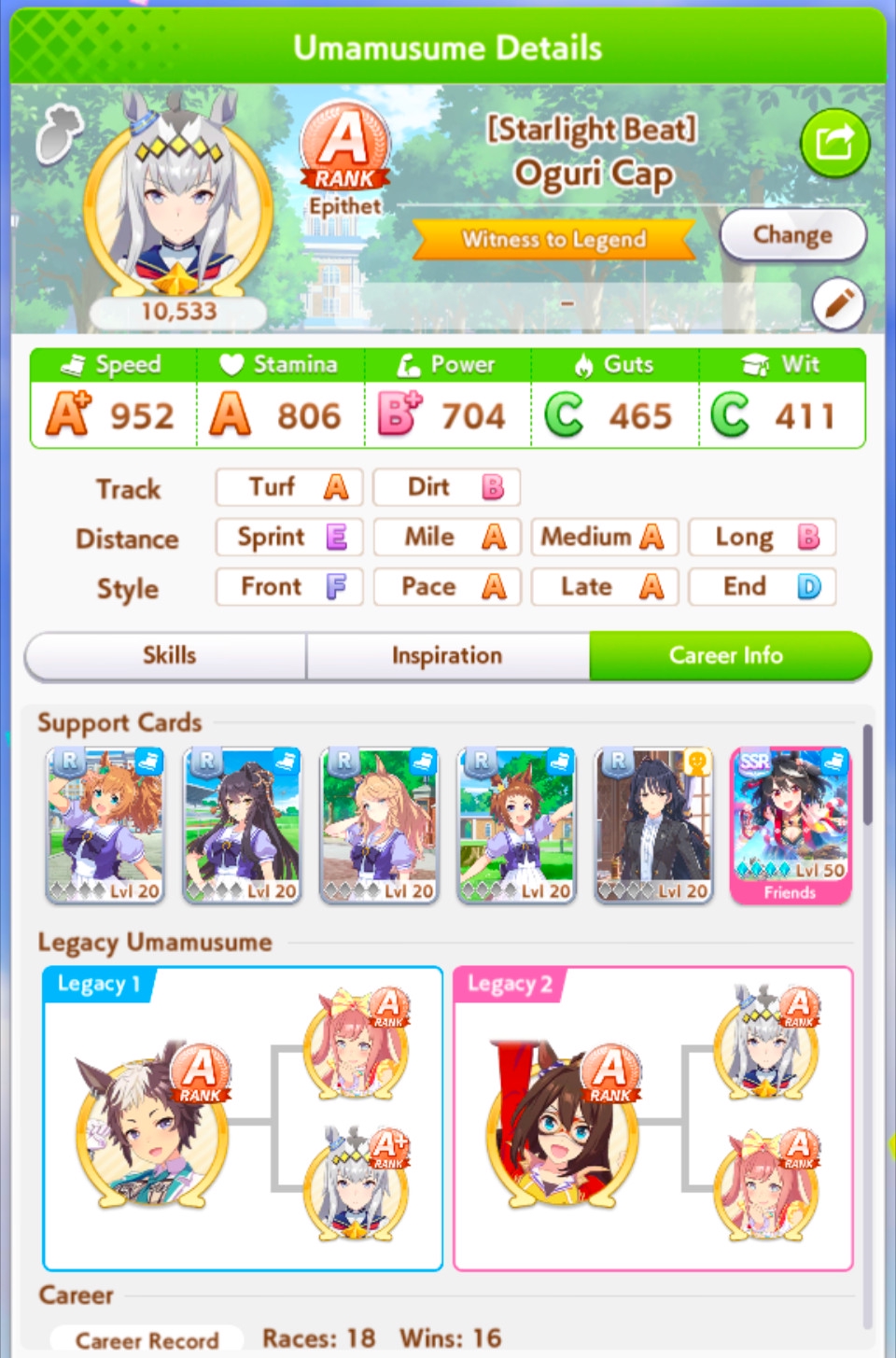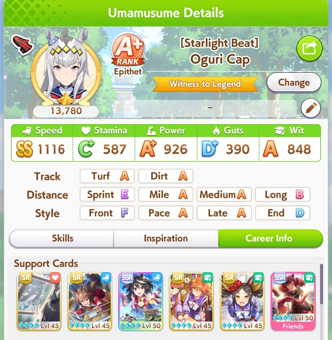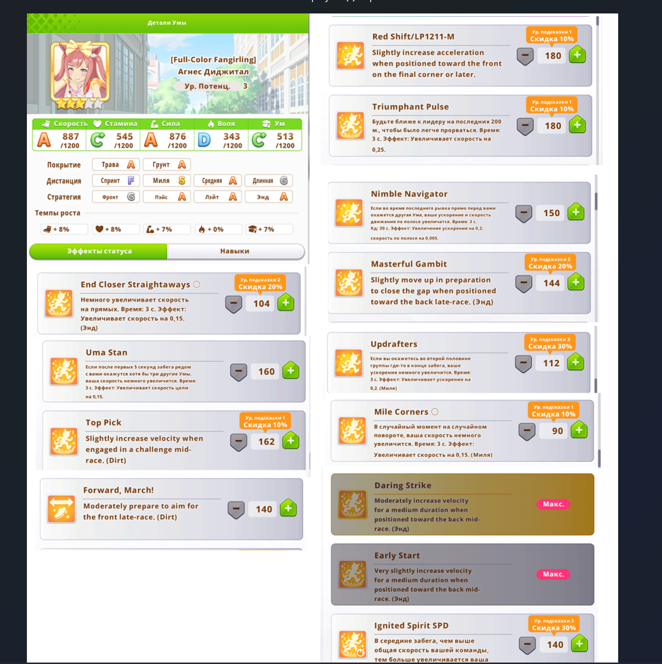 По сути сделал только пэйс Огурю хоть на что-то похожую А+ и то чисто потому что она по дефолту идёт. С Пасой нихрена по сути не получилось, есть варианты на 1150 спида 900 павера и 600 вит, но прямо чето очень такое себе и по скилам почти ничего. И дефолтная Урара полудебаффер на 1100 спида. Пробовал Голд Щичу покачать но она - зараза не тренится совсем, планирую еще маяну если и с ней не пойдёт то даже и идти не с чем будет. Как-то ни к одному турику так тяжко не шло.