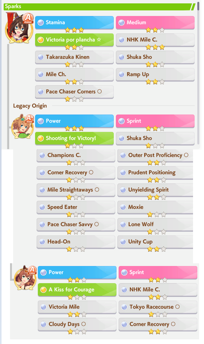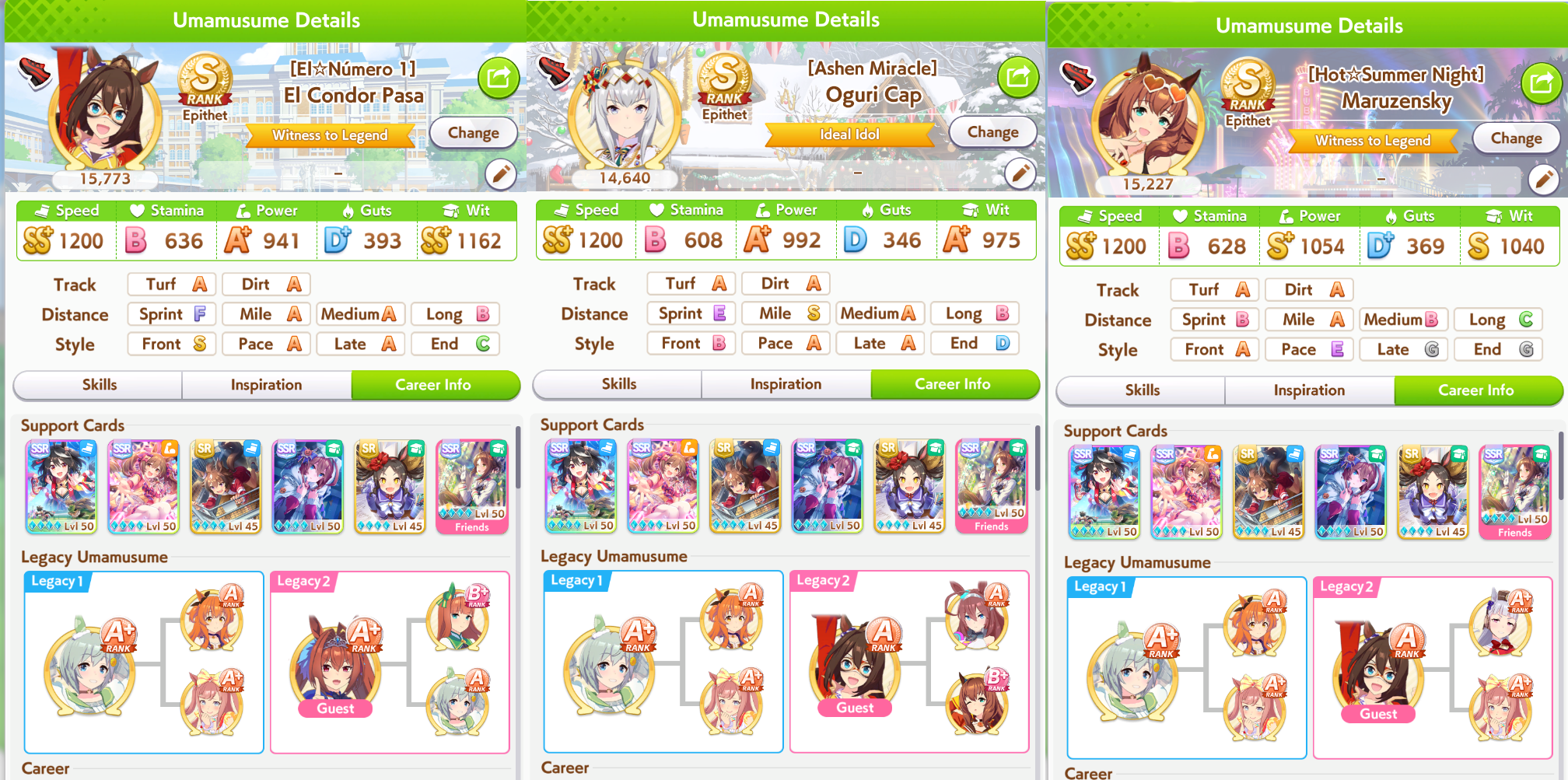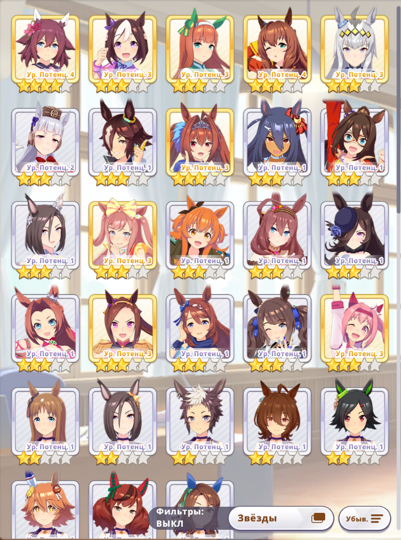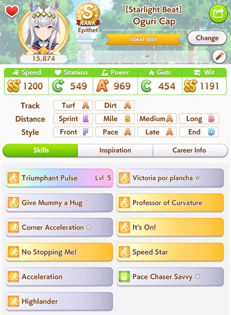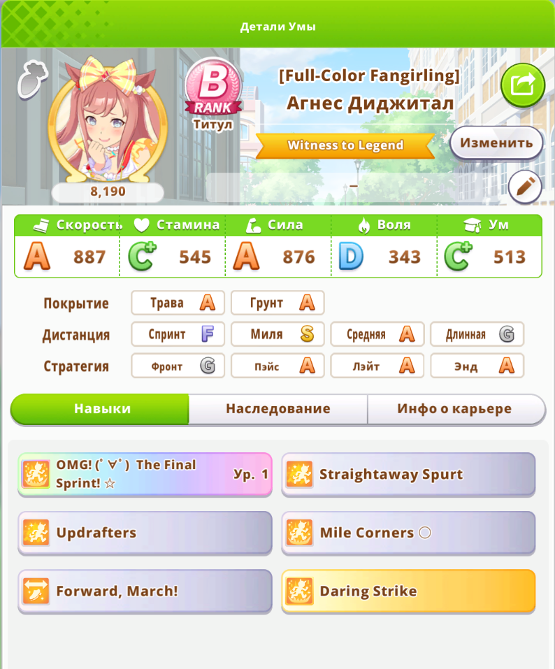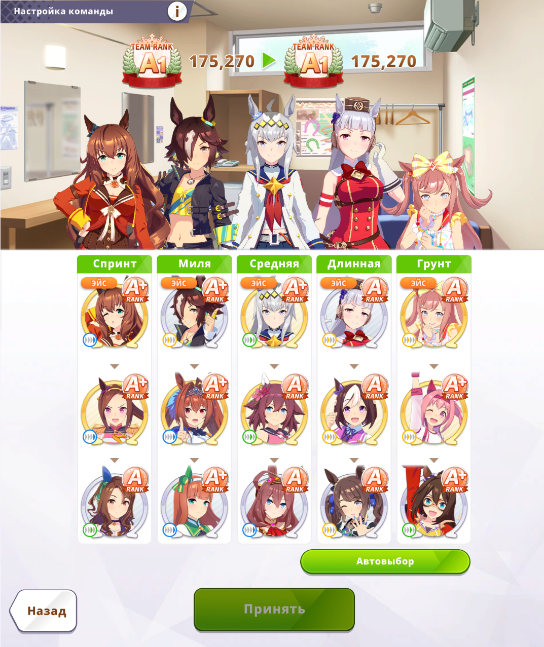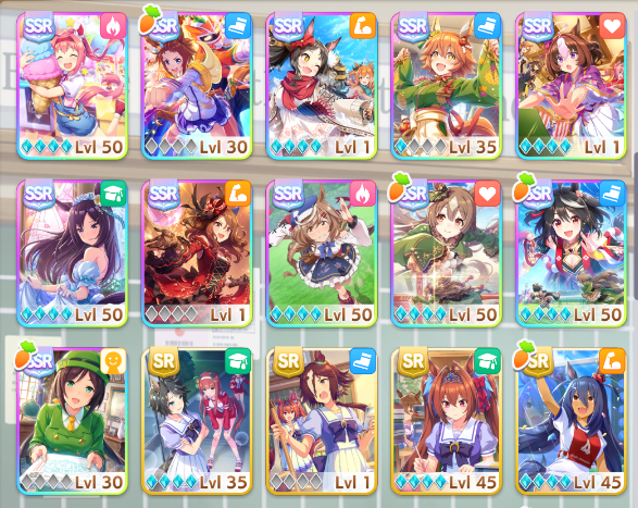 По сути сделал только пэйс Огурю хоть на что-то похожую А+ и то чисто потому что она по дефолту идёт. С Пасой нихрена по сути не получилось, есть варианты на 1150 спида 900 павера и 600 вит, но прямо чето очень такое себе и по скилам почти ничего. И дефолтная Урара полудебаффер на 1100 спида. Пробовал Голд Щичу покачать но она - зараза не тренится совсем, планирую еще маяну если и с ней не пойдёт то даже и идти не с чем будет. Как-то ни к одному турику так тяжко не шло.