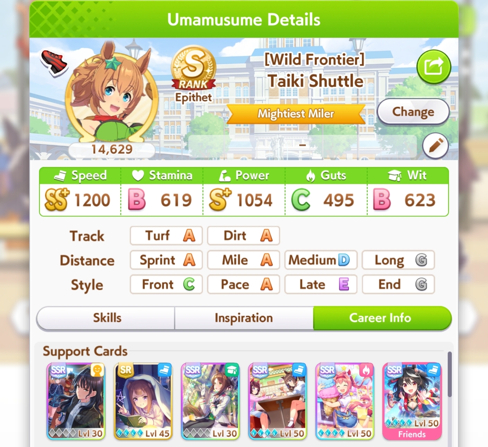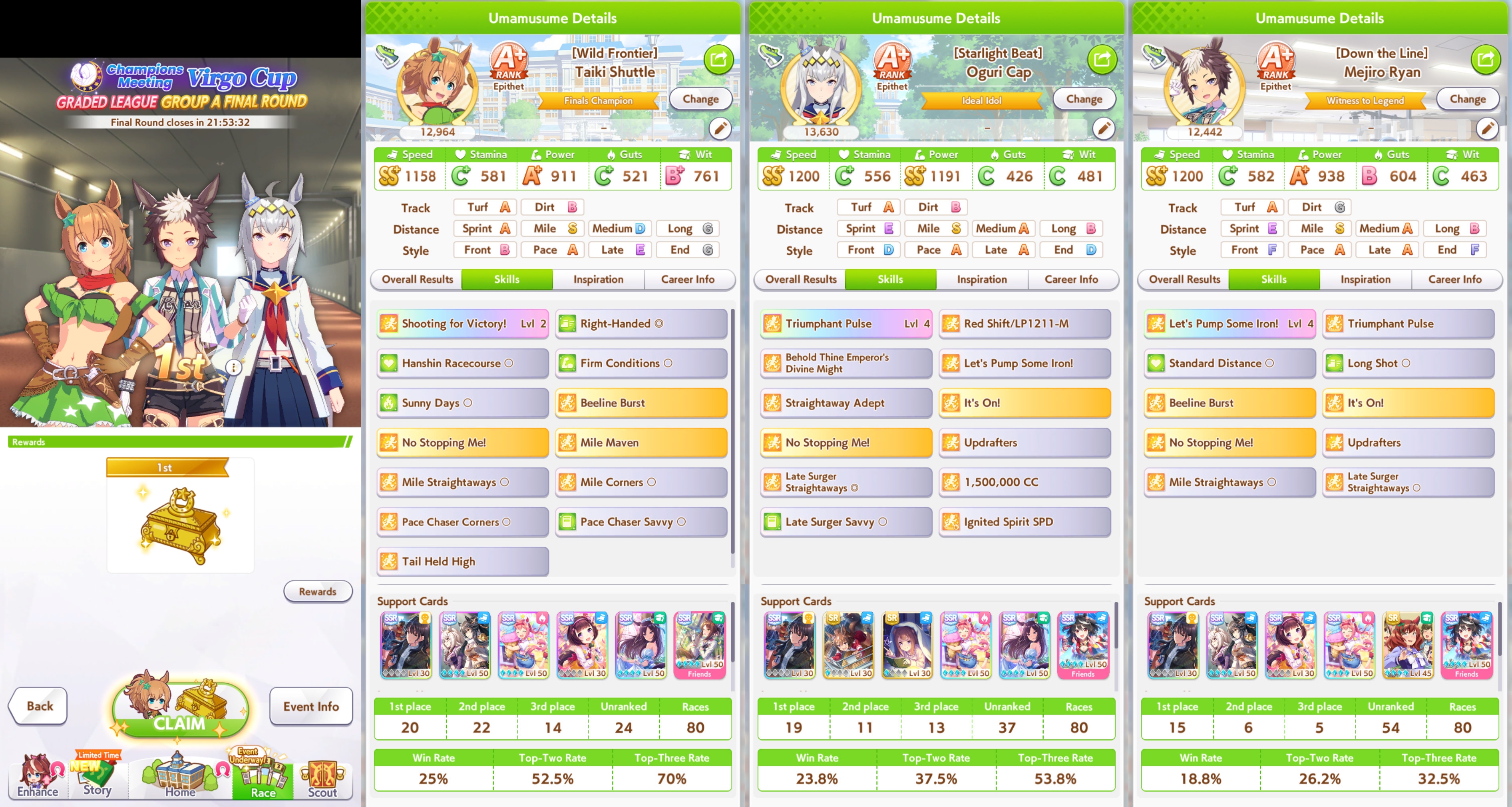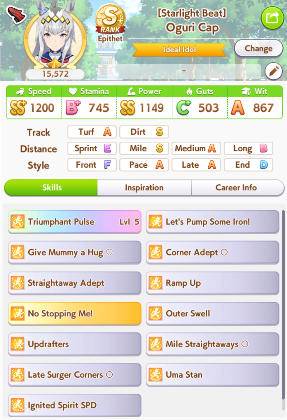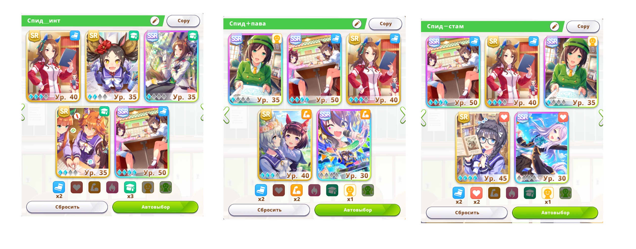 По сути сделал только пэйс Огурю хоть на что-то похожую А+ и то чисто потому что она по дефолту идёт. С Пасой нихрена по сути не получилось, есть варианты на 1150 спида 900 павера и 600 вит, но прямо чето очень такое себе и по скилам почти ничего. И дефолтная Урара полудебаффер на 1100 спида. Пробовал Голд Щичу покачать но она - зараза не тренится совсем, планирую еще маяну если и с ней не пойдёт то даже и идти не с чем будет. Как-то ни к одному турику так тяжко не шло.