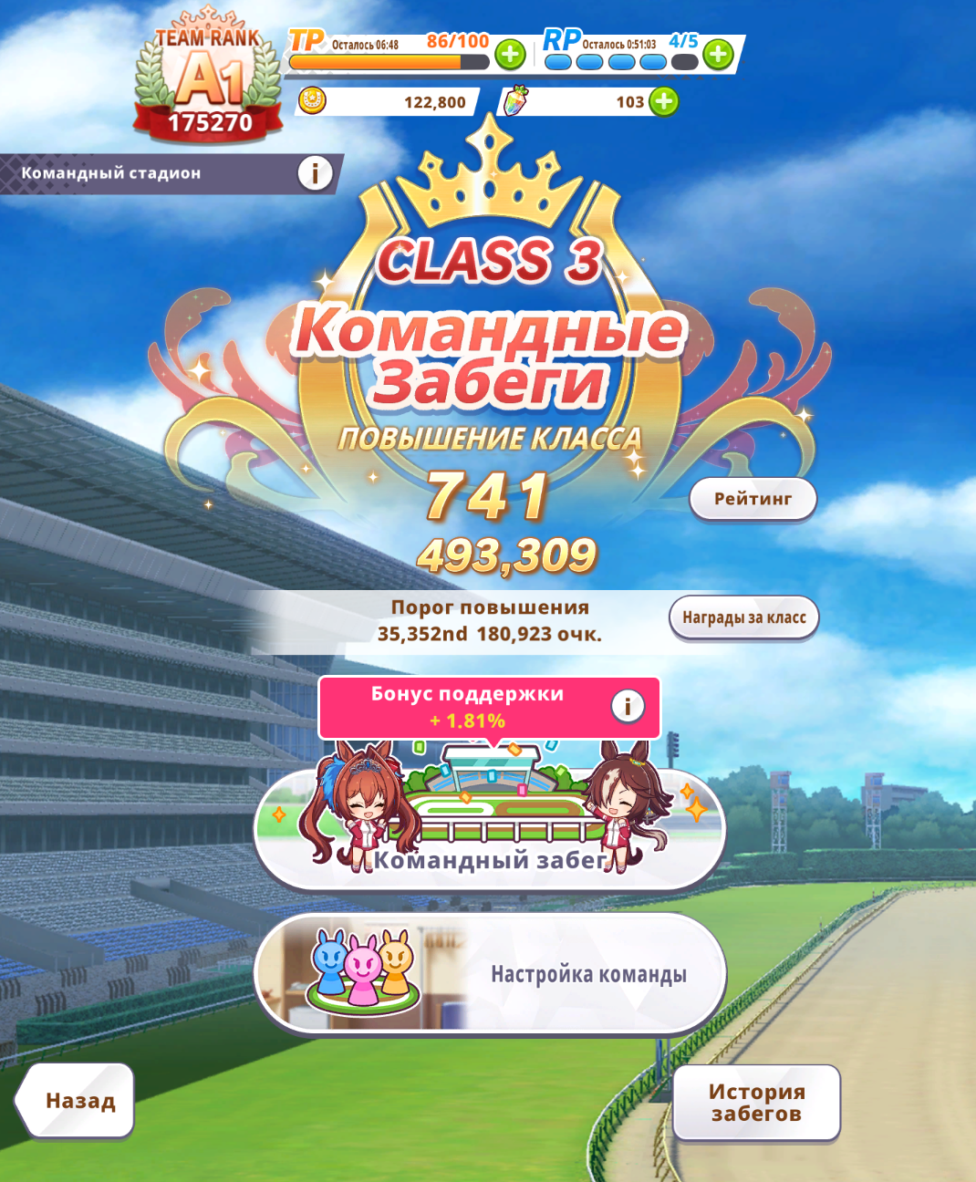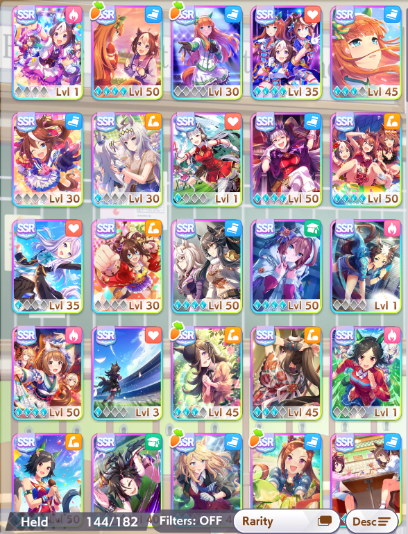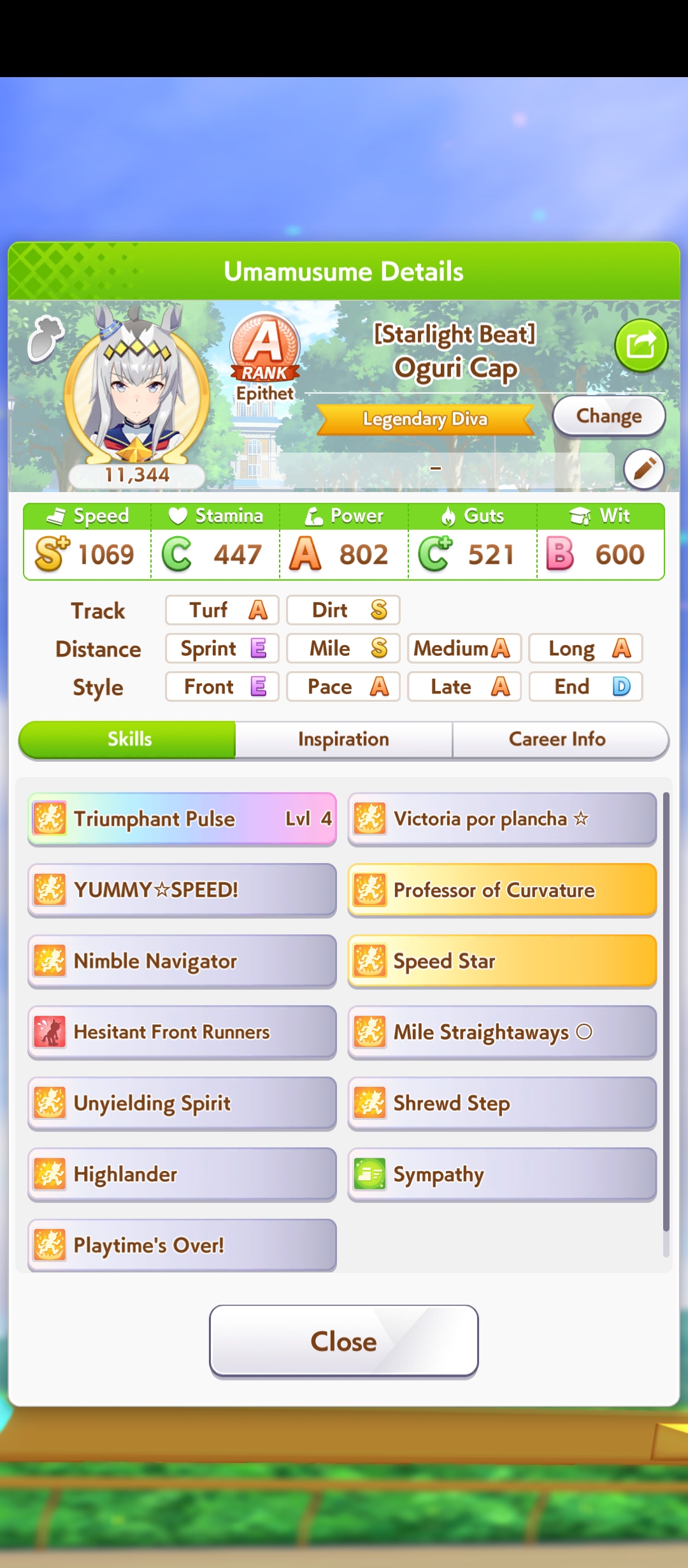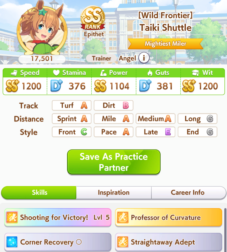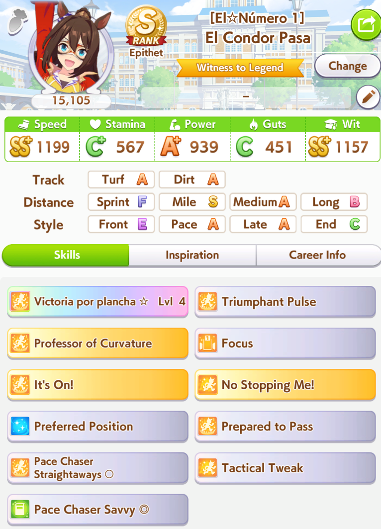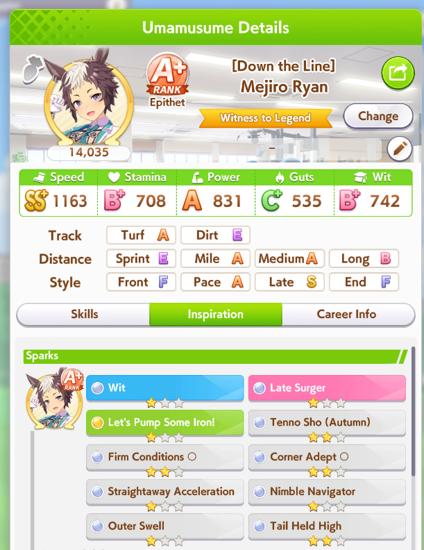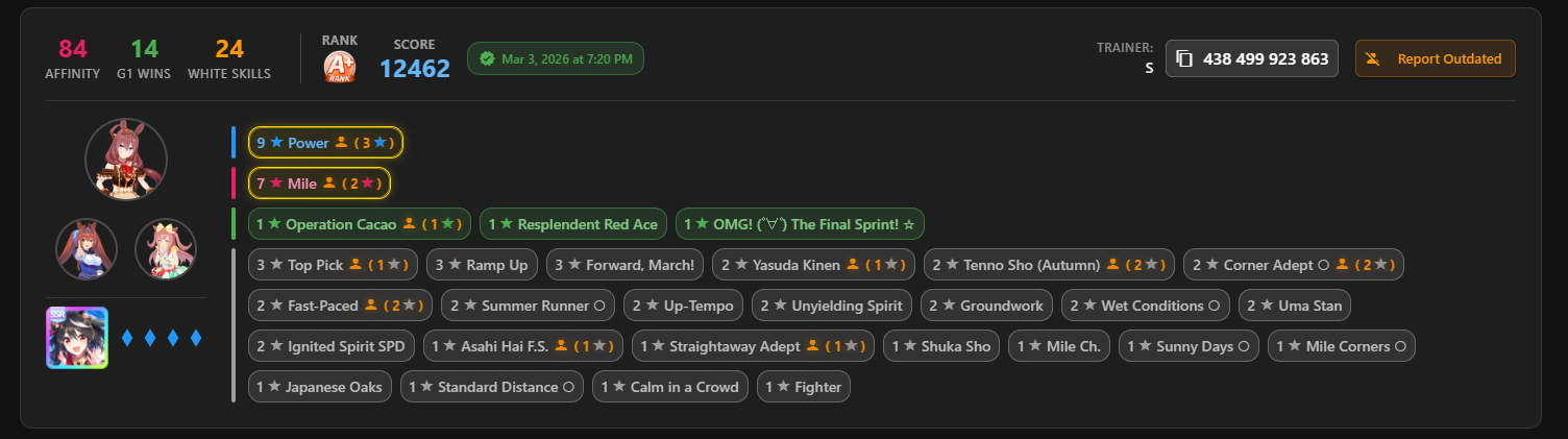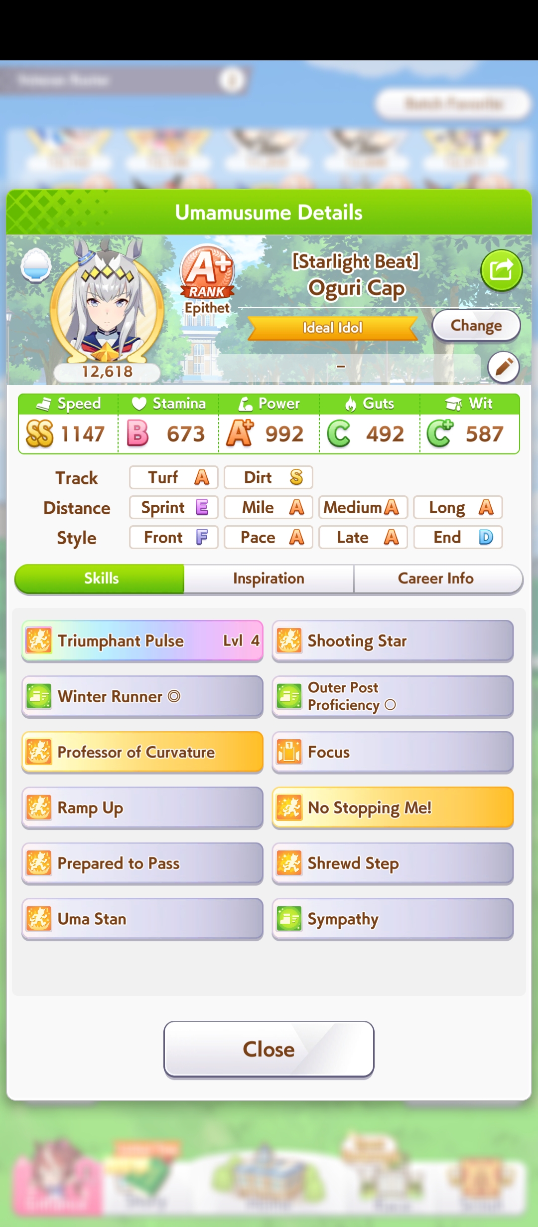 По сути сделал только пэйс Огурю хоть на что-то похожую А+ и то чисто потому что она по дефолту идёт. С Пасой нихрена по сути не получилось, есть варианты на 1150 спида 900 павера и 600 вит, но прямо чето очень такое себе и по скилам почти ничего. И дефолтная Урара полудебаффер на 1100 спида. Пробовал Голд Щичу покачать но она - зараза не тренится совсем, планирую еще маяну если и с ней не пойдёт то даже и идти не с чем будет. Как-то ни к одному турику так тяжко не шло.