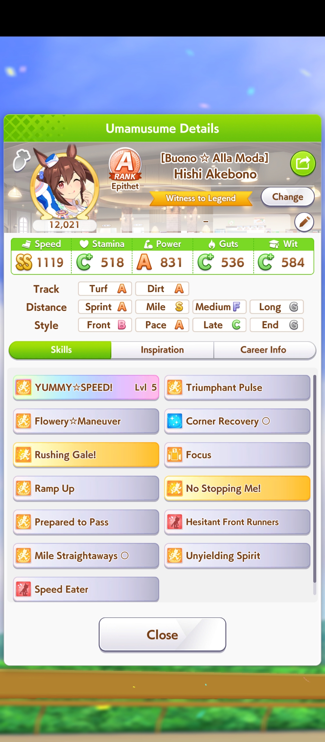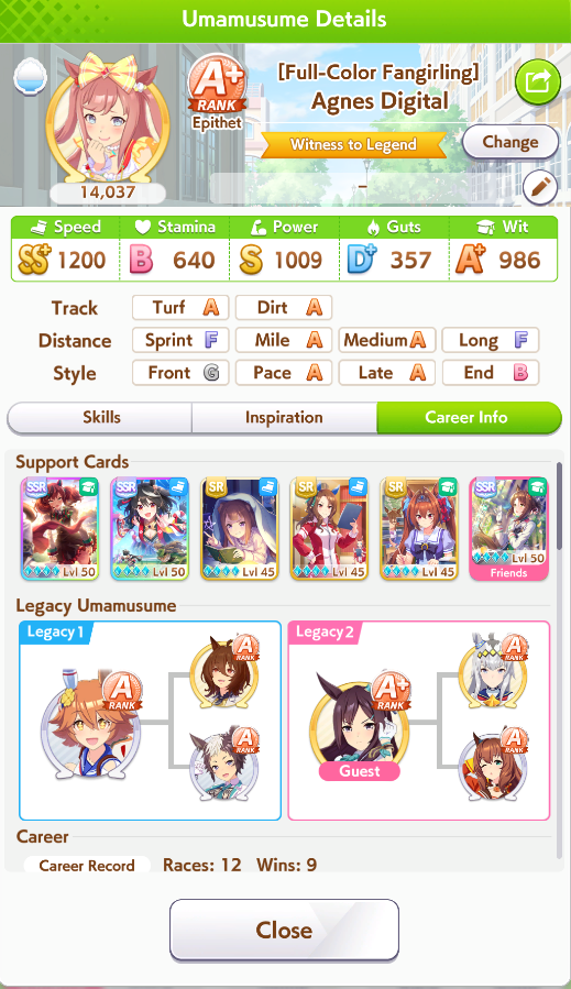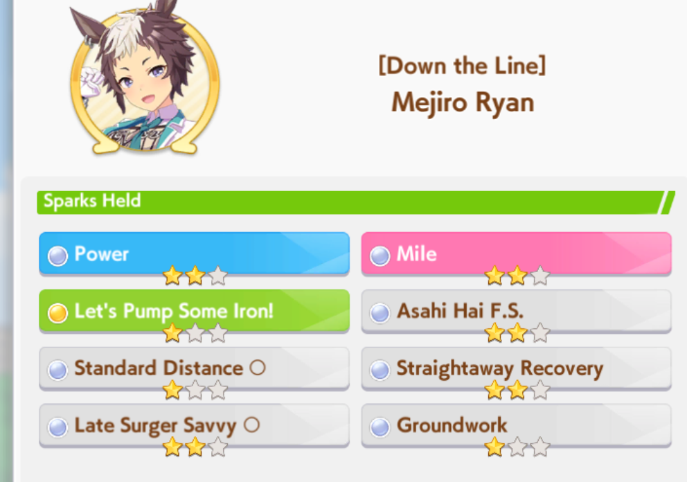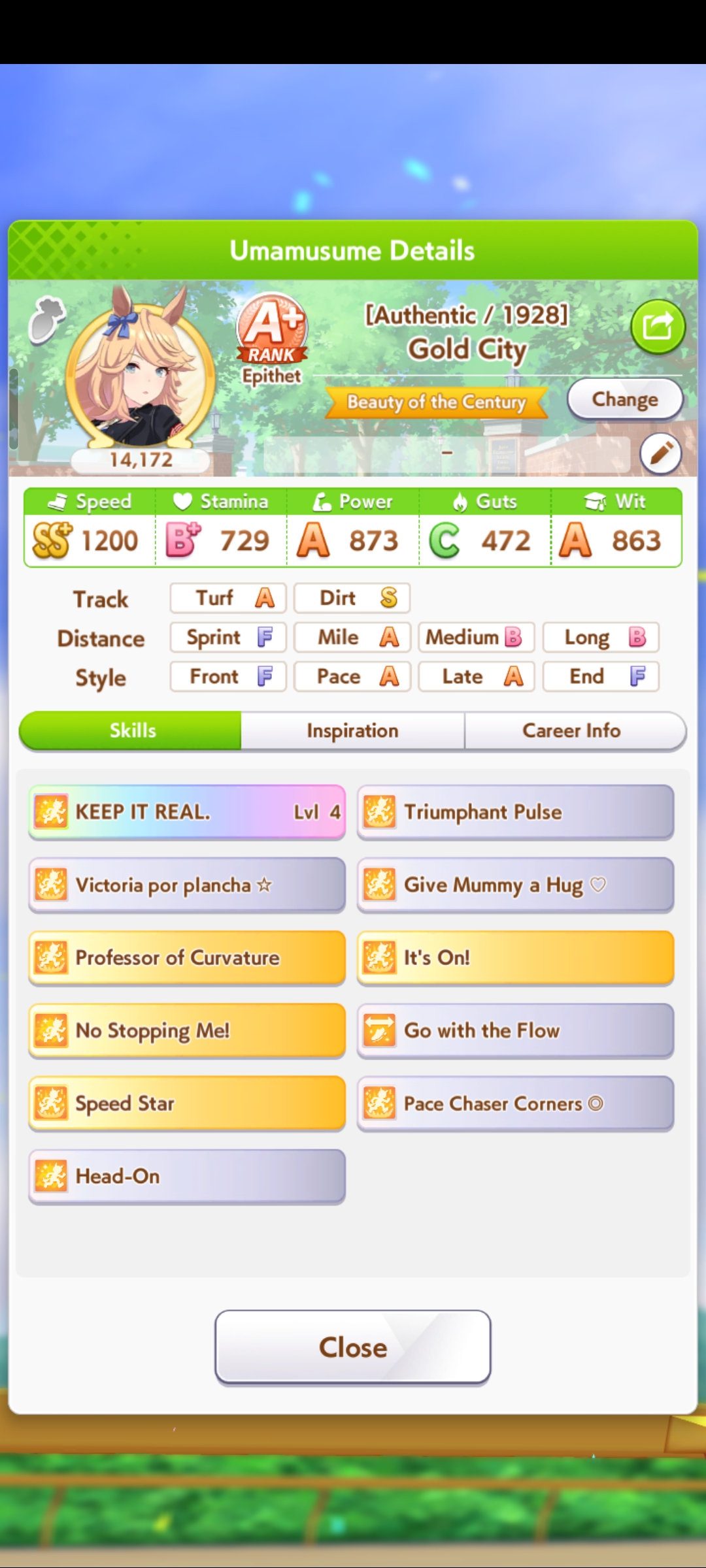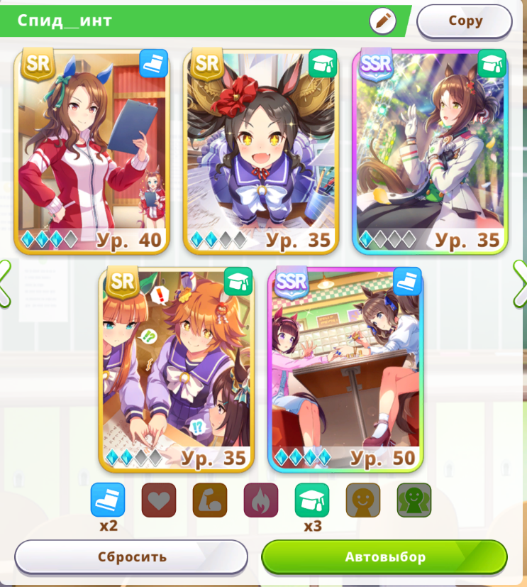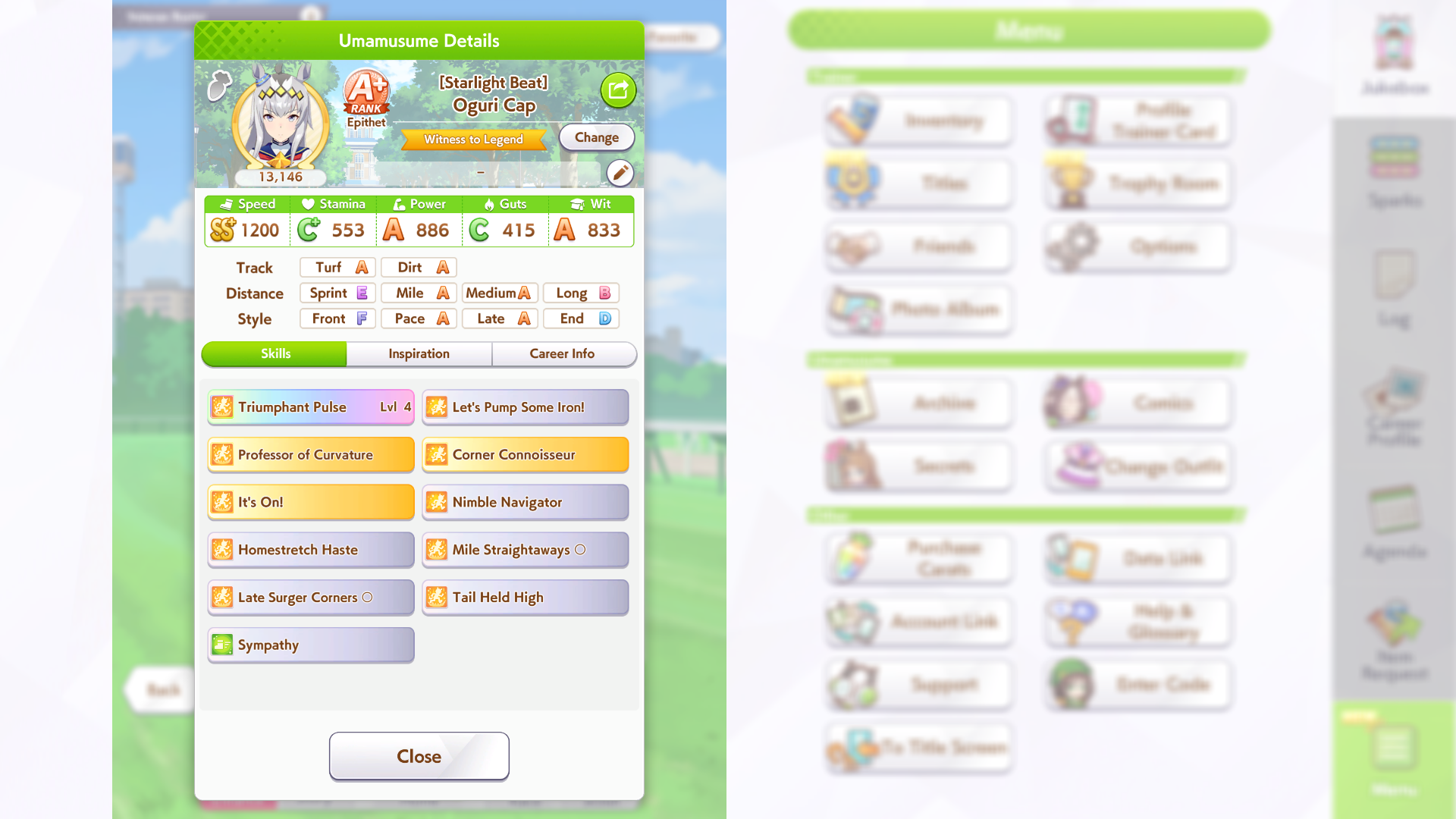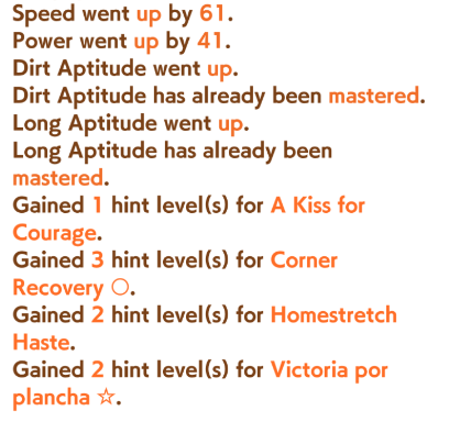 По сути сделал только пэйс Огурю хоть на что-то похожую А+ и то чисто потому что она по дефолту идёт. С Пасой нихрена по сути не получилось, есть варианты на 1150 спида 900 павера и 600 вит, но прямо чето очень такое себе и по скилам почти ничего. И дефолтная Урара полудебаффер на 1100 спида. Пробовал Голд Щичу покачать но она - зараза не тренится совсем, планирую еще маяну если и с ней не пойдёт то даже и идти не с чем будет. Как-то ни к одному турику так тяжко не шло.