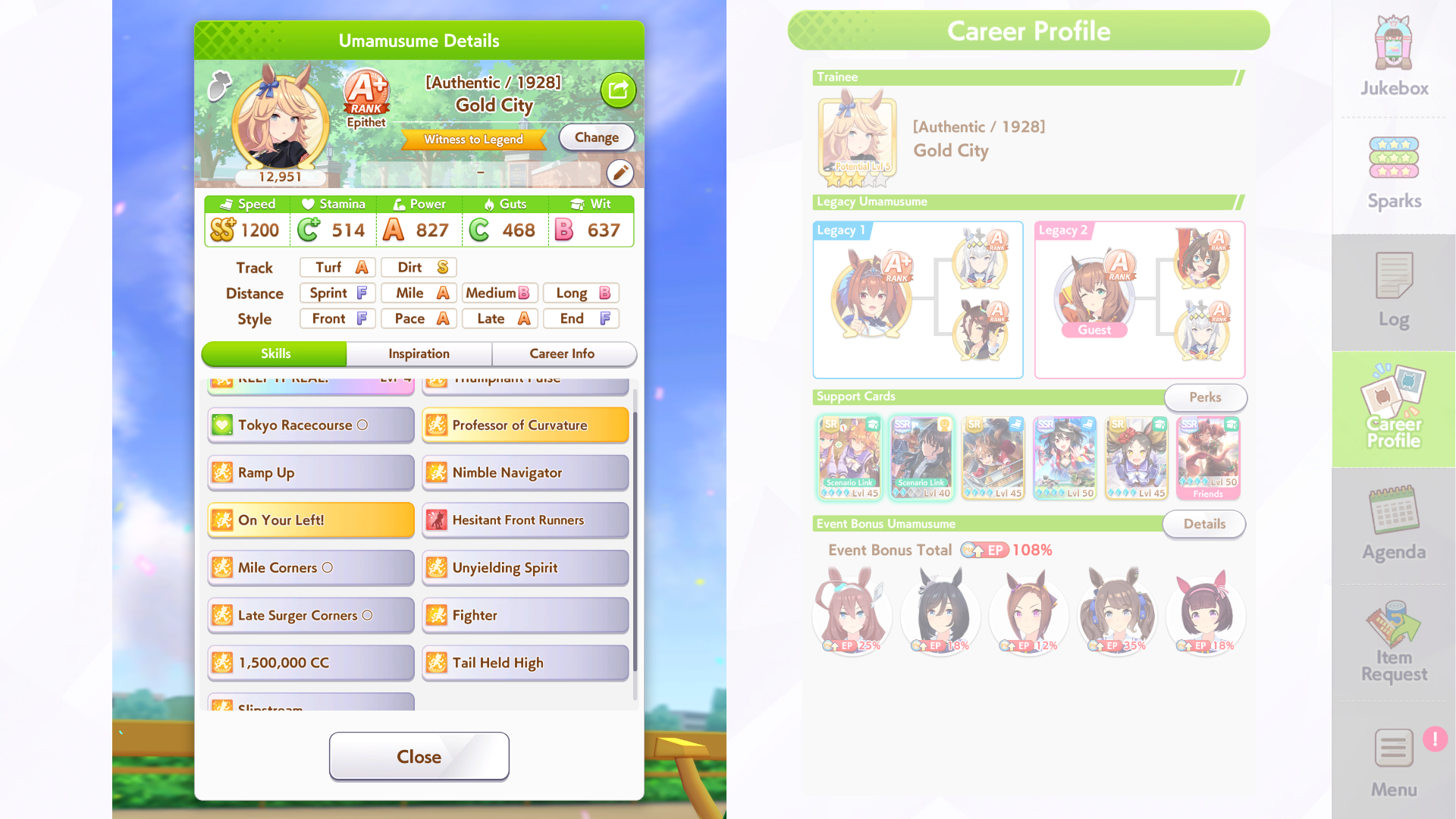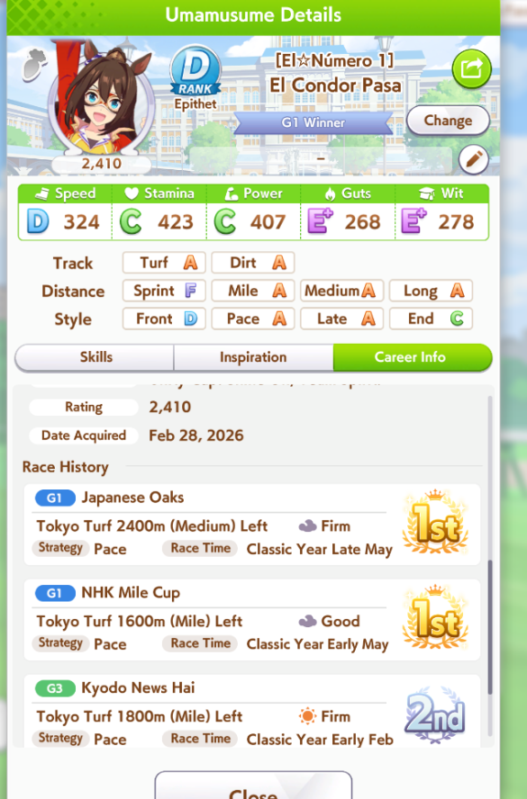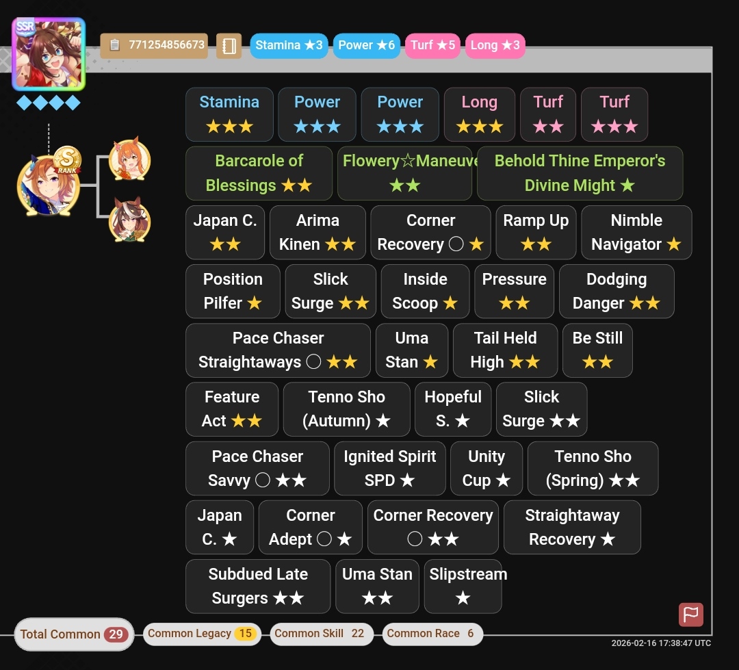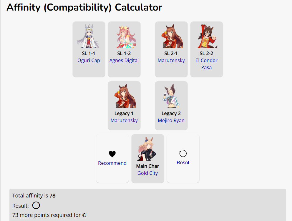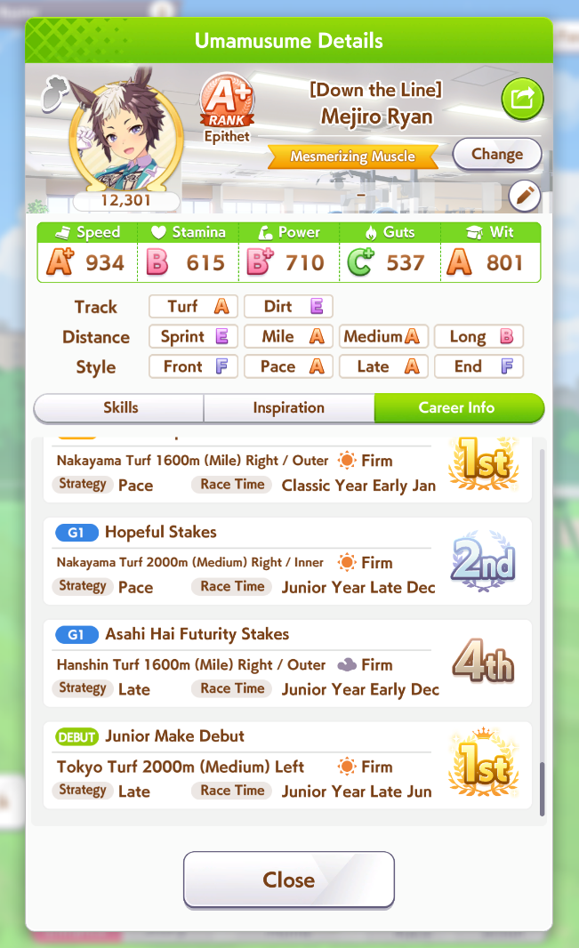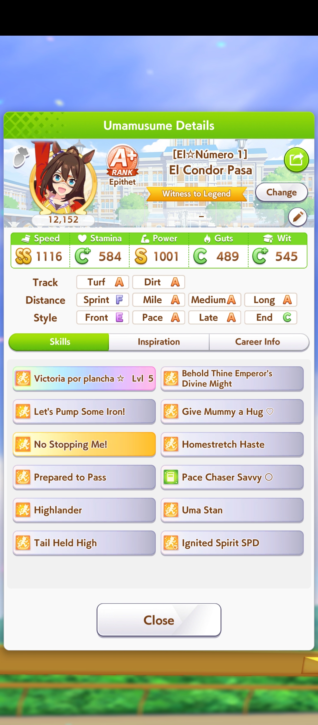 По сути сделал только пэйс Огурю хоть на что-то похожую А+ и то чисто потому что она по дефолту идёт. С Пасой нихрена по сути не получилось, есть варианты на 1150 спида 900 павера и 600 вит, но прямо чето очень такое себе и по скилам почти ничего. И дефолтная Урара полудебаффер на 1100 спида. Пробовал Голд Щичу покачать но она - зараза не тренится совсем, планирую еще маяну если и с ней не пойдёт то даже и идти не с чем будет. Как-то ни к одному турику так тяжко не шло.