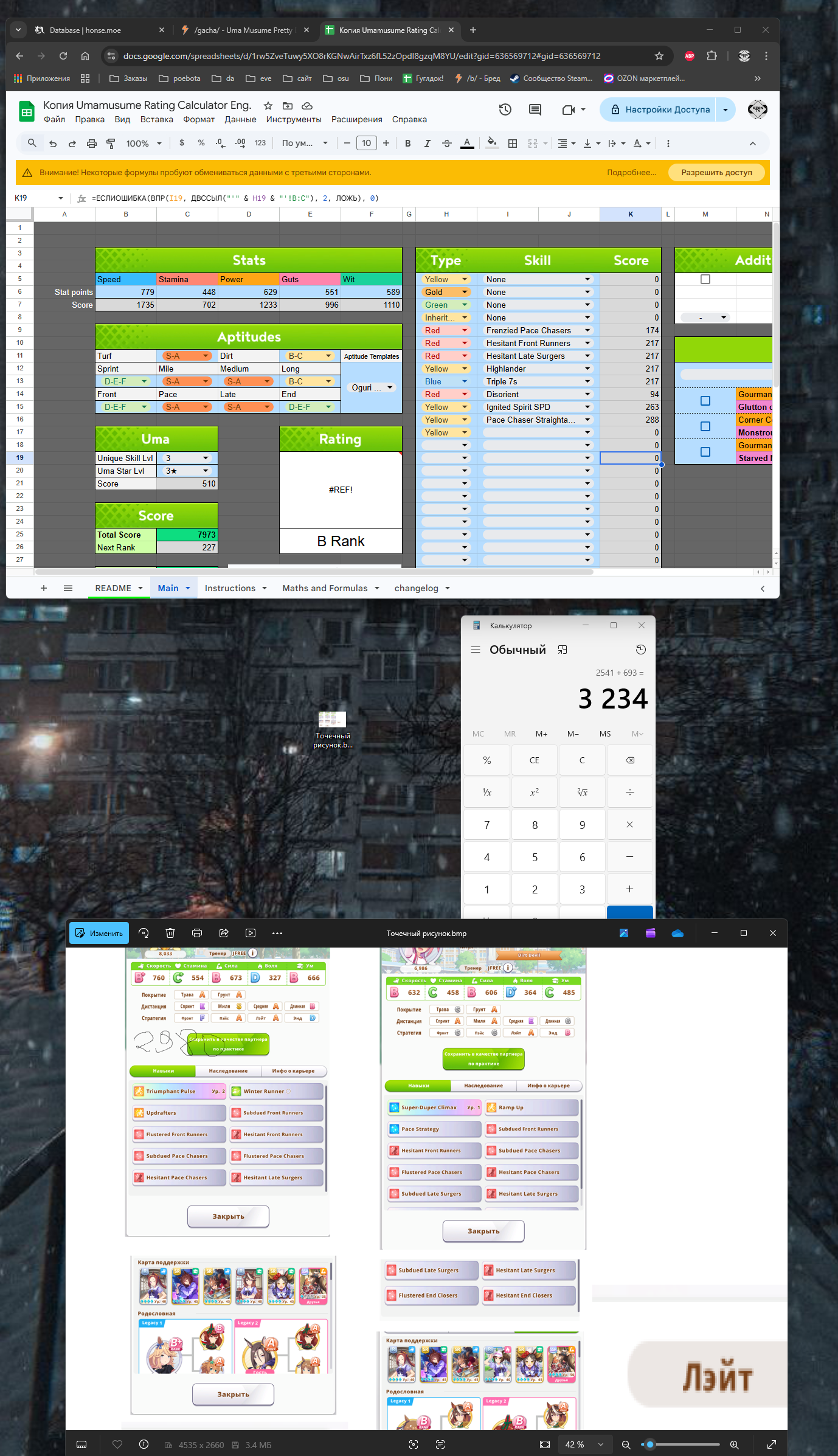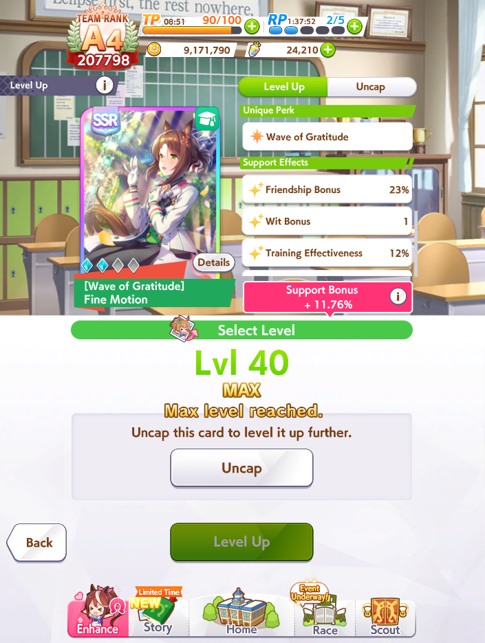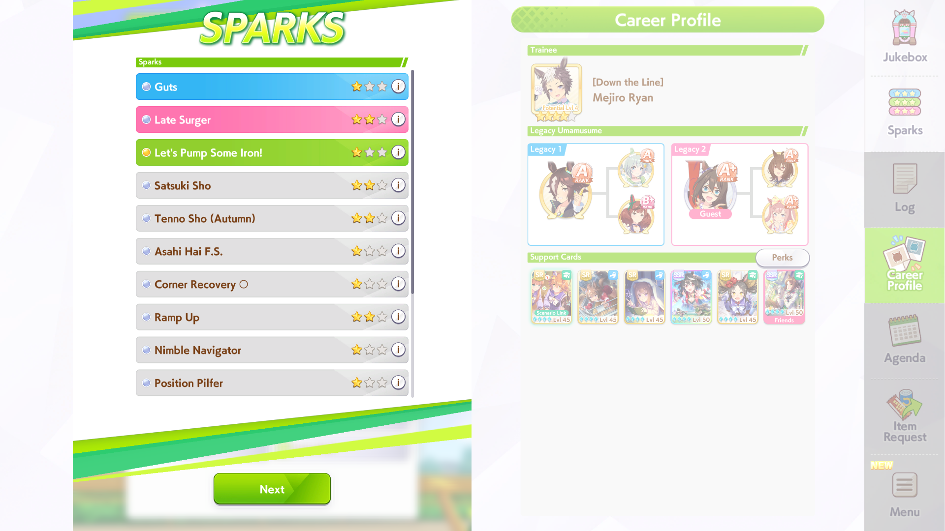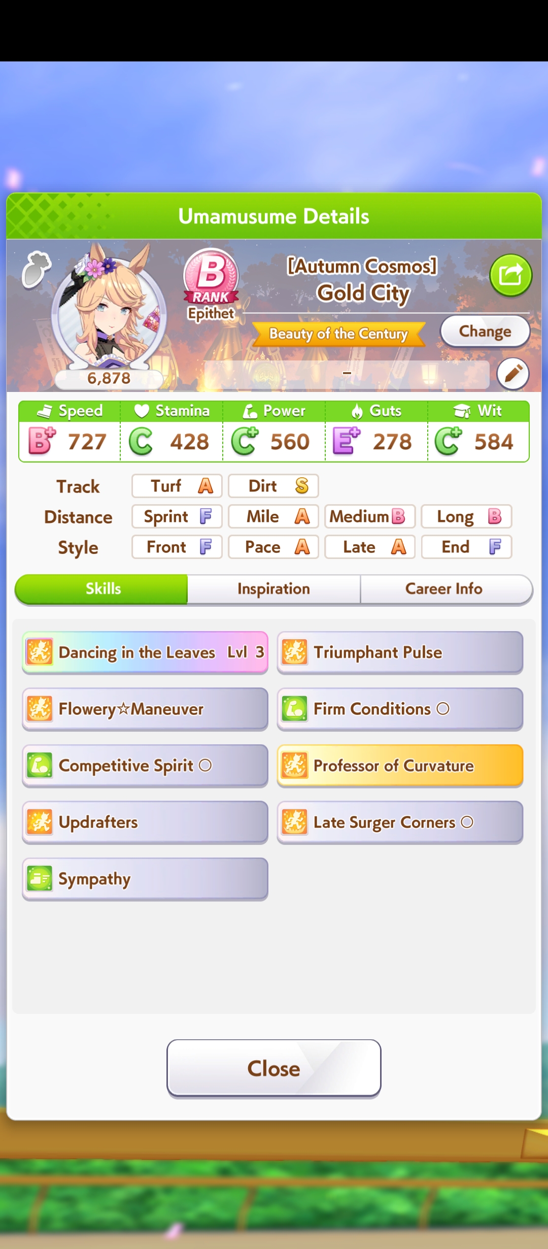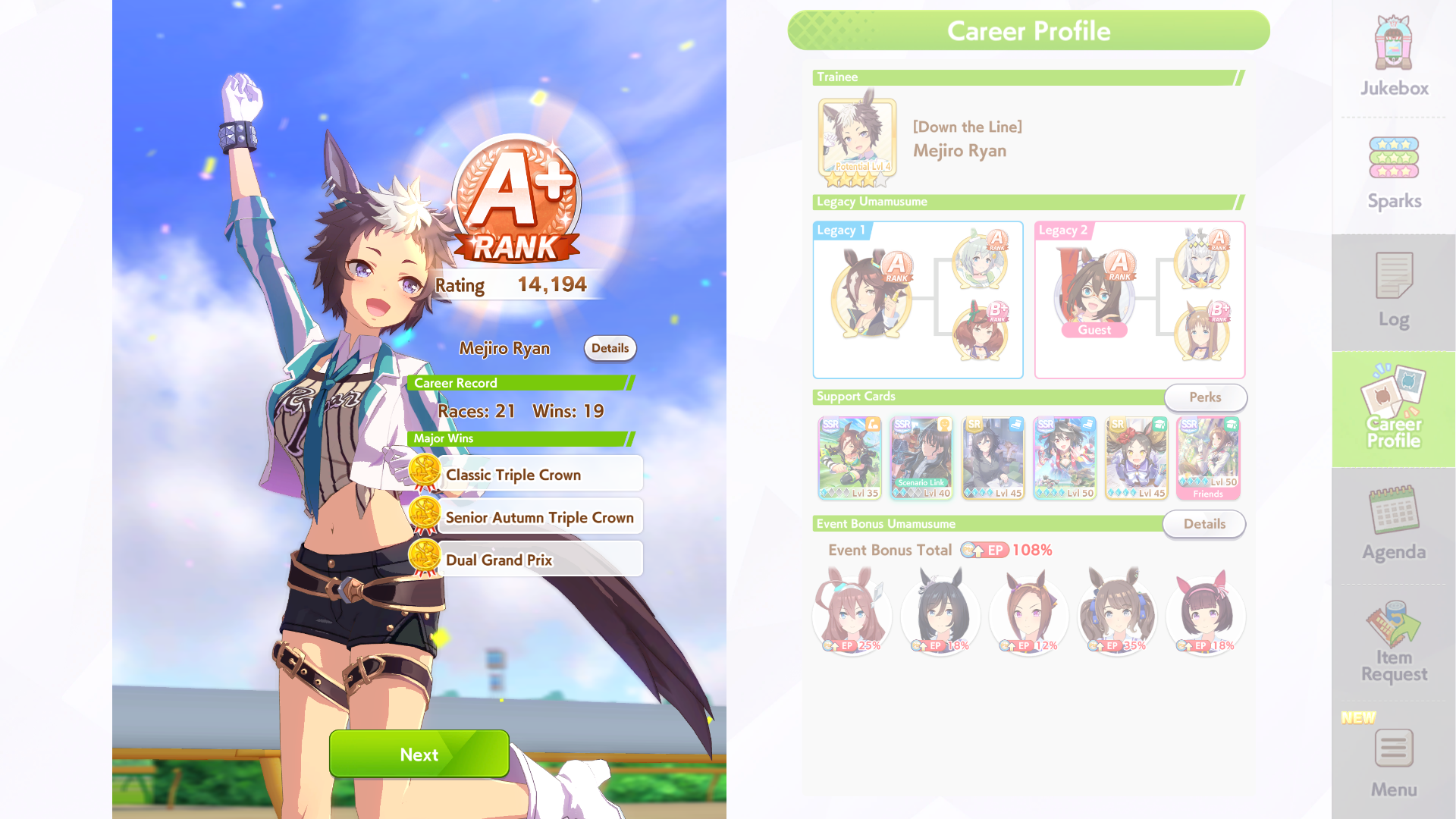 По сути сделал только пэйс Огурю хоть на что-то похожую А+ и то чисто потому что она по дефолту идёт. С Пасой нихрена по сути не получилось, есть варианты на 1150 спида 900 павера и 600 вит, но прямо чето очень такое себе и по скилам почти ничего. И дефолтная Урара полудебаффер на 1100 спида. Пробовал Голд Щичу покачать но она - зараза не тренится совсем, планирую еще маяну если и с ней не пойдёт то даже и идти не с чем будет. Как-то ни к одному турику так тяжко не шло.