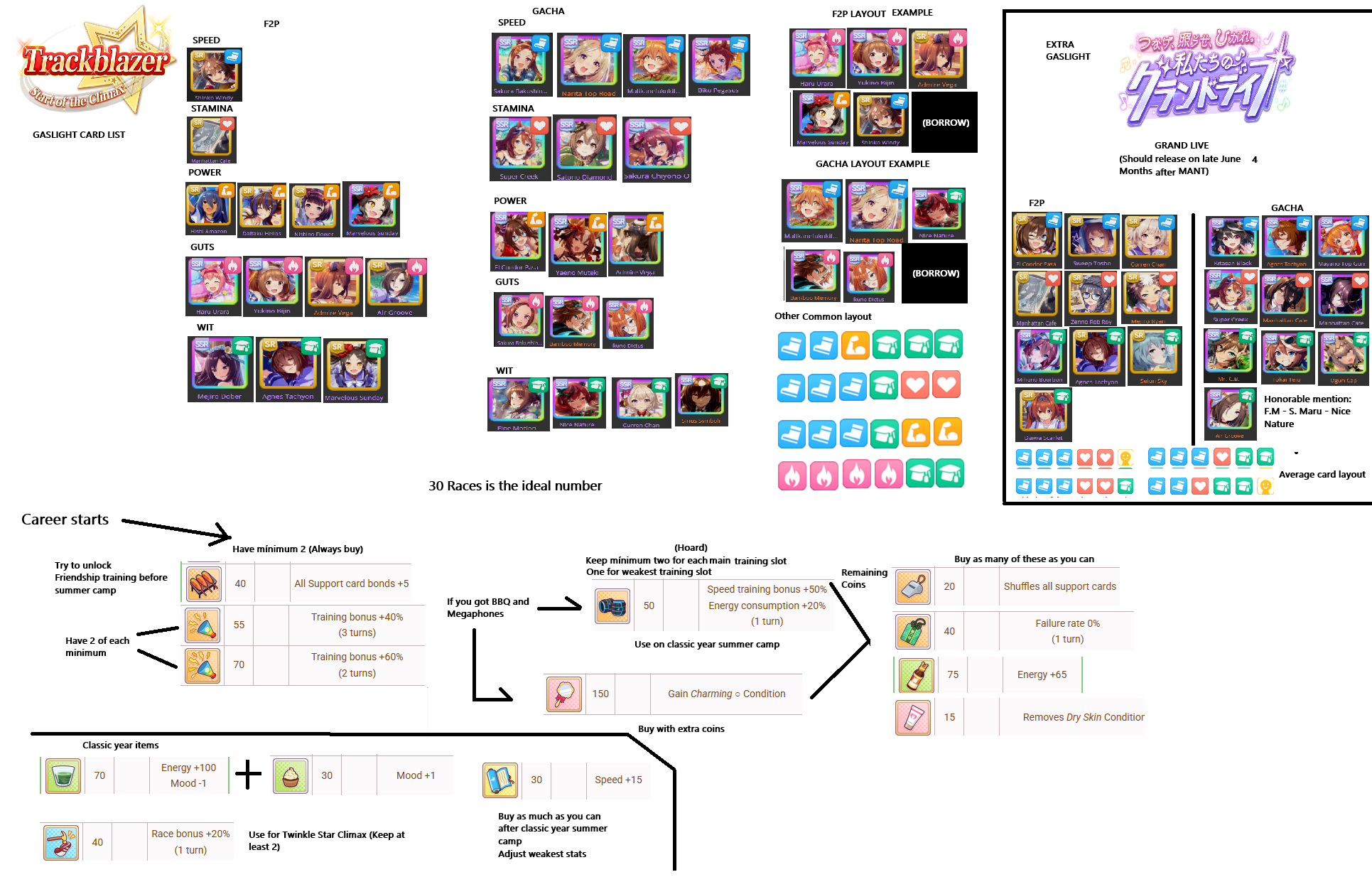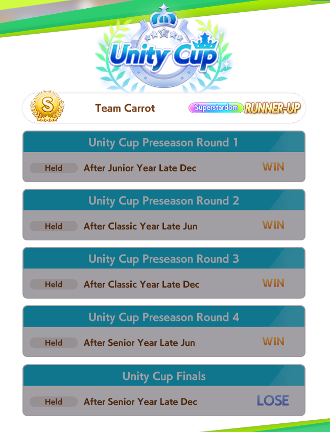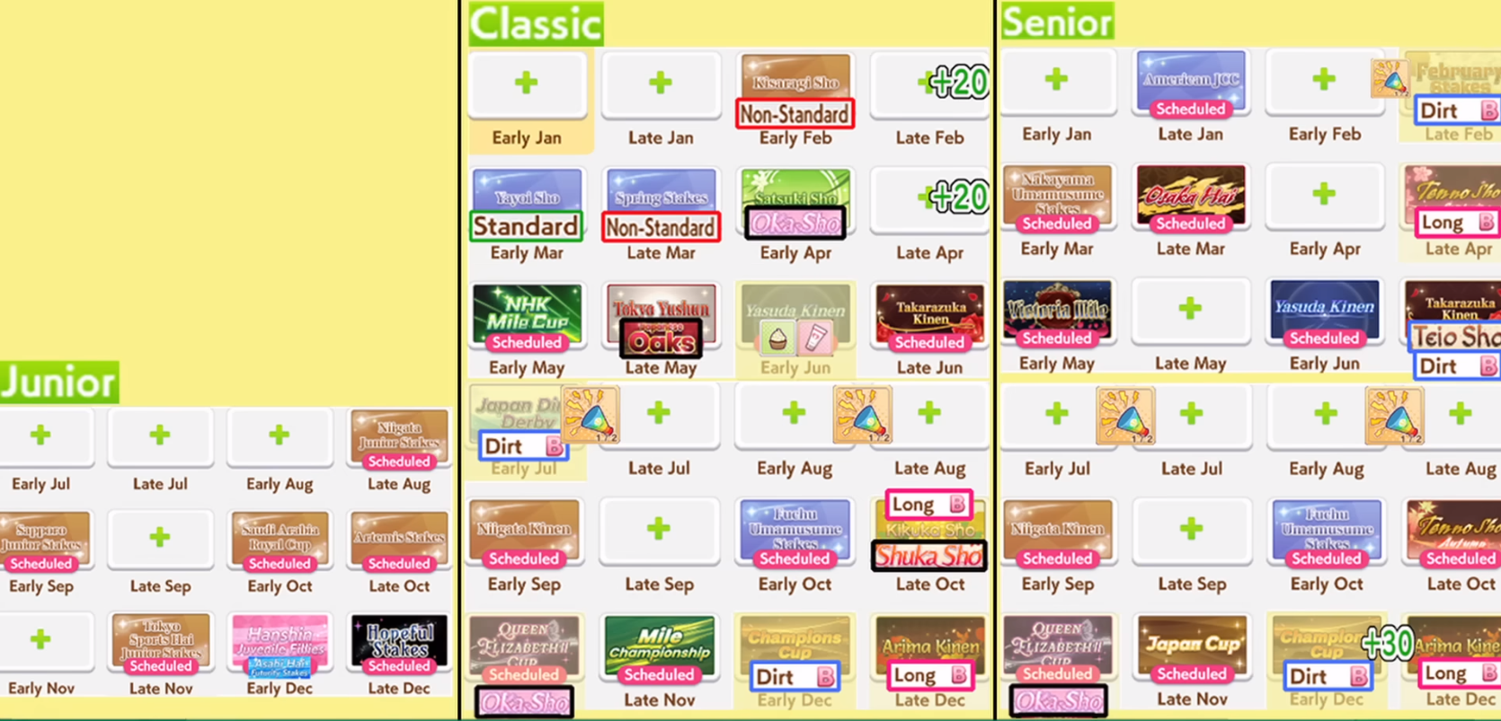 Эпитеты будут давать статы. Поэтому ты хочешь их собрать. Их целая туча. Но в основном - это трипл кравны, трипл тиары, дёрт, миля, спринт кинги. Расписание сам себе собираешь. Вот пример от протыка, лучше посмотрите, он там разбирает, что и когда лучше юзать. Из-за значительного притока статов с эпитетов очень сильны лошади, которые могут бегать Всё. МВП - Огури. Она может фармить все дёрты, все мили, все лонги. Протык говорит, что если тренишь лошадку с плохой милей - лучше набрать спарков в буст мили хотя бы до Б, чем брать Эску до нужной дистанции на цм. 2 вида карьеры - карьера с лонгами - трипл кравн, карьера без лонгов - трипл тиара. Когда появлется Райвал - то против него лучше пробежать.