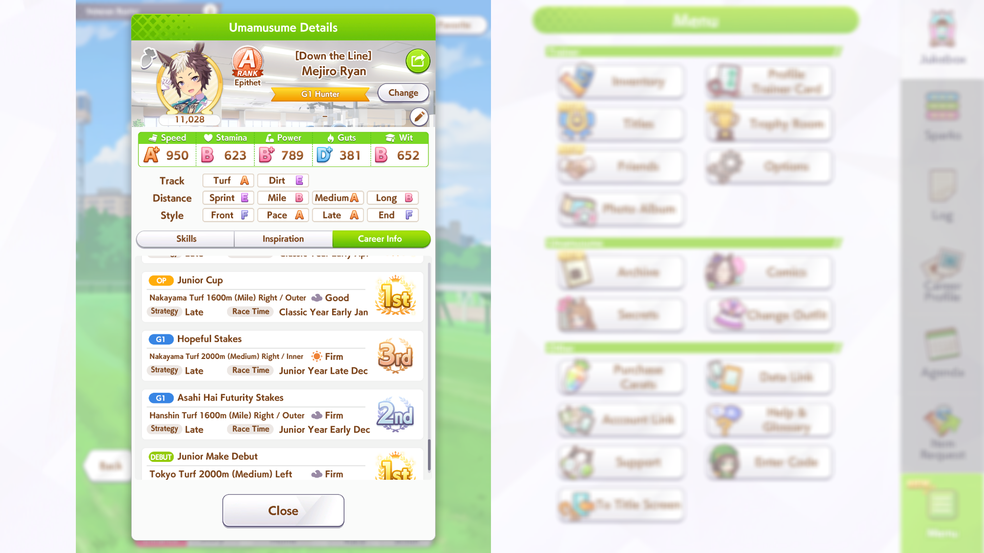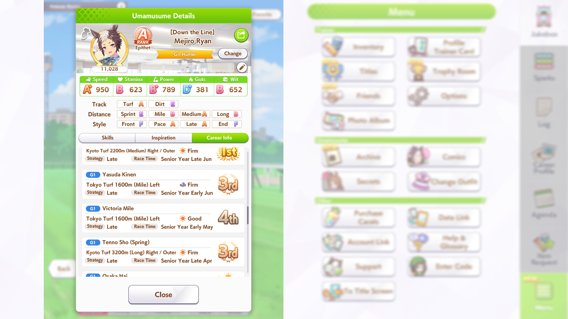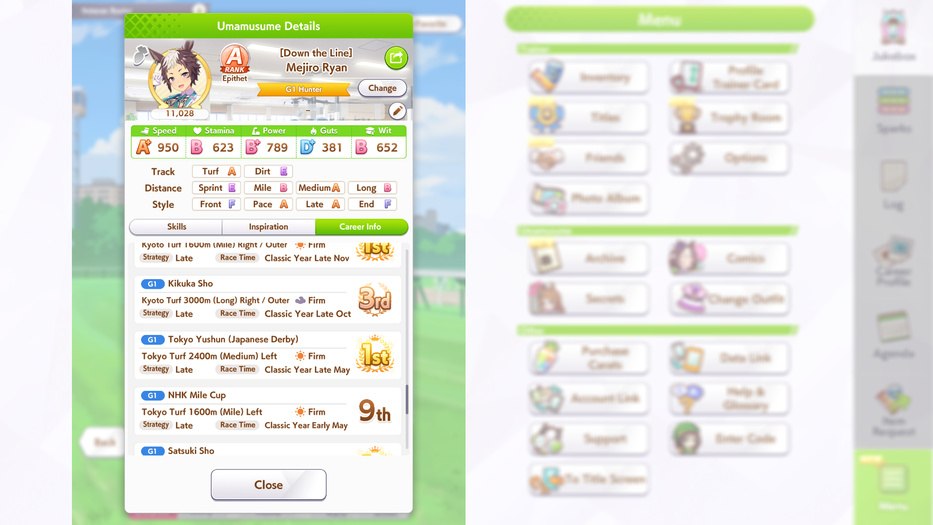 Эпитеты будут давать статы. Поэтому ты хочешь их собрать. Их целая туча. Но в основном - это трипл кравны, трипл тиары, дёрт, миля, спринт кинги. Расписание сам себе собираешь. Вот пример от протыка, лучше посмотрите, он там разбирает, что и когда лучше юзать. Из-за значительного притока статов с эпитетов очень сильны лошади, которые могут бегать Всё. МВП - Огури. Она может фармить все дёрты, все мили, все лонги. Протык говорит, что если тренишь лошадку с плохой милей - лучше набрать спарков в буст мили хотя бы до Б, чем брать Эску до нужной дистанции на цм. 2 вида карьеры - карьера с лонгами - трипл кравн, карьера без лонгов - трипл тиара. Когда появлется Райвал - то против него лучше пробежать.