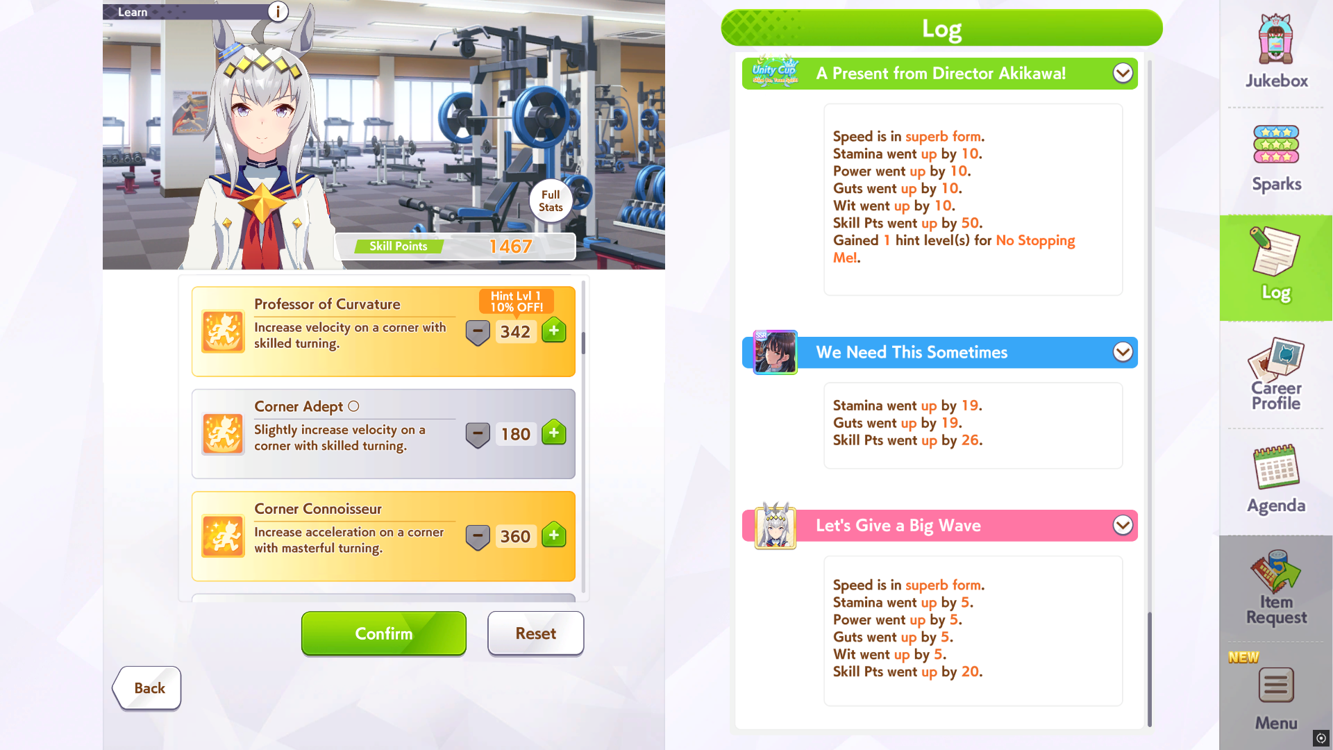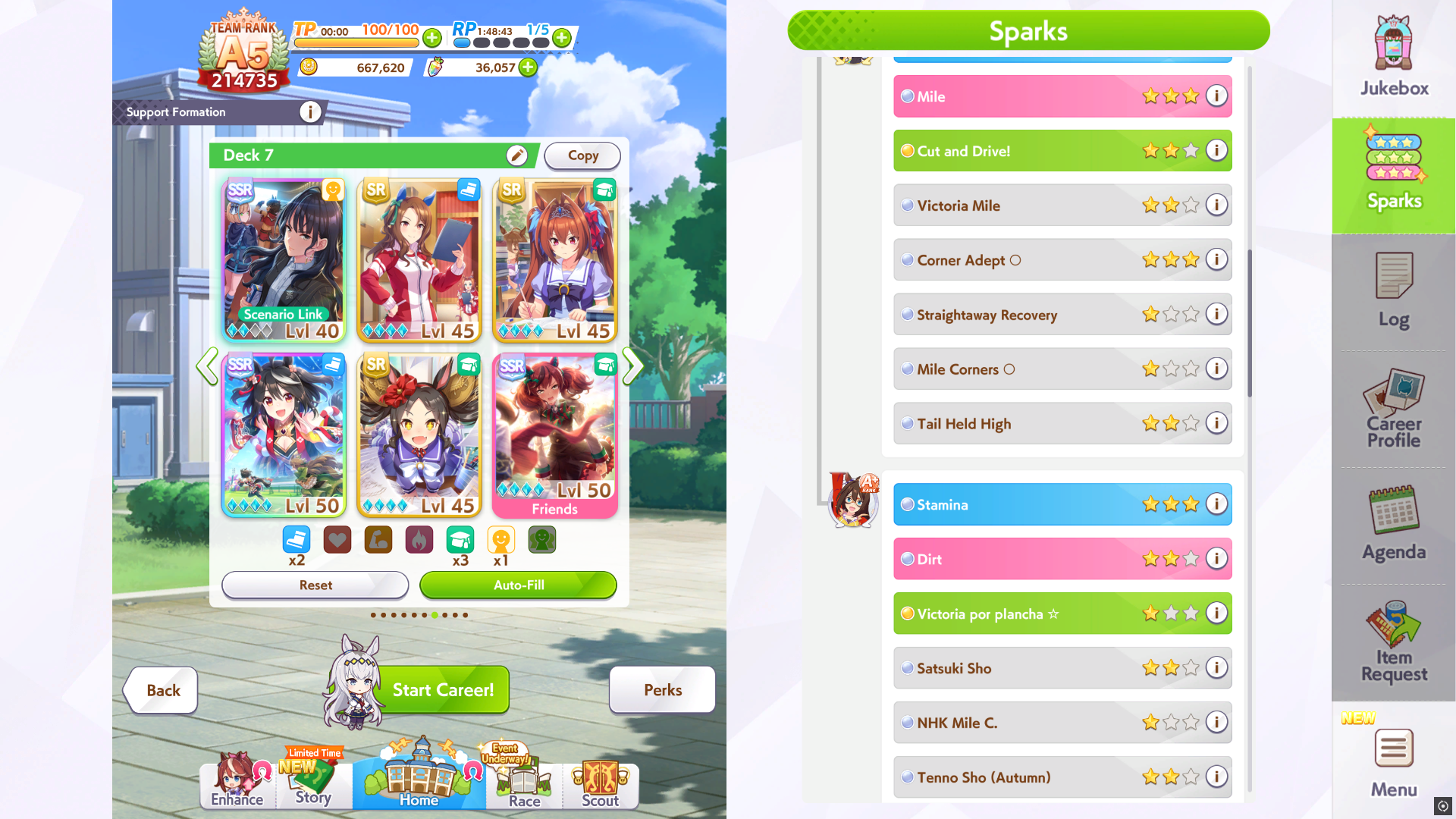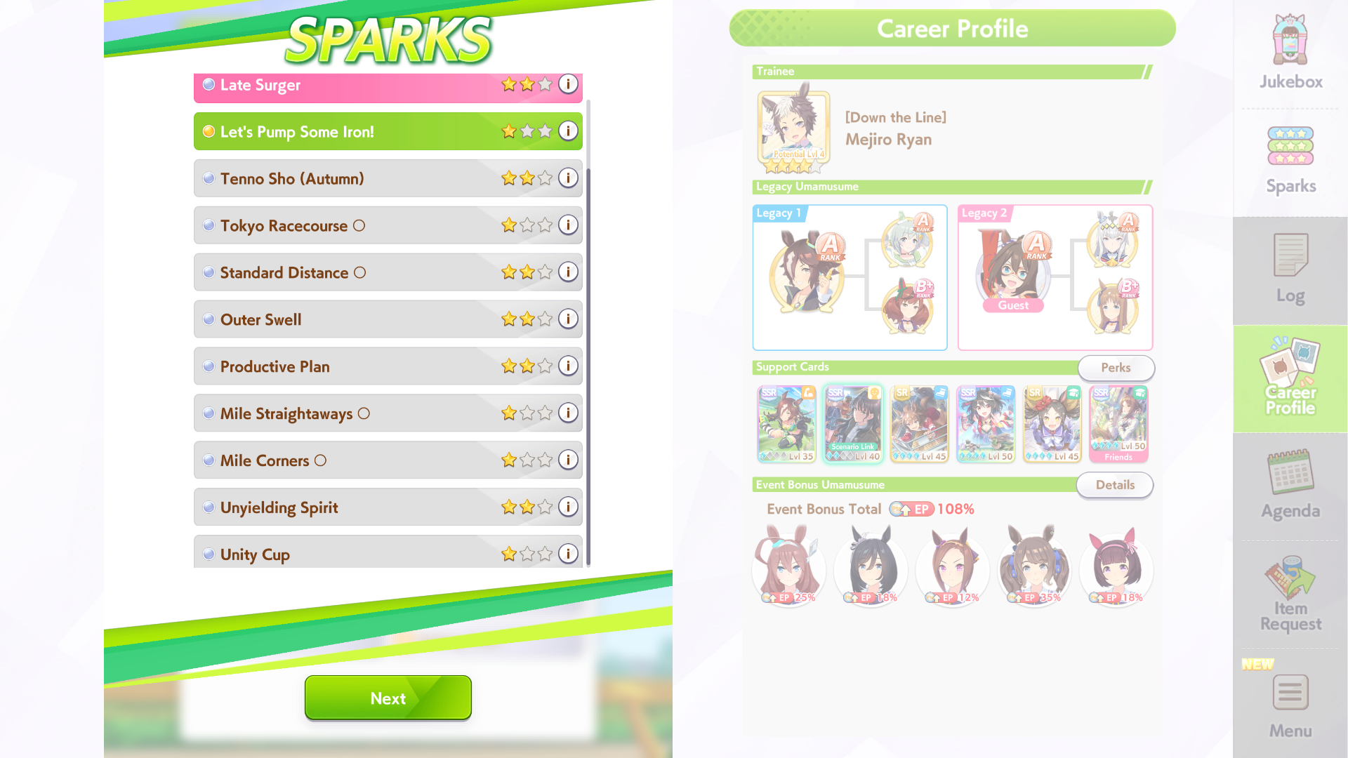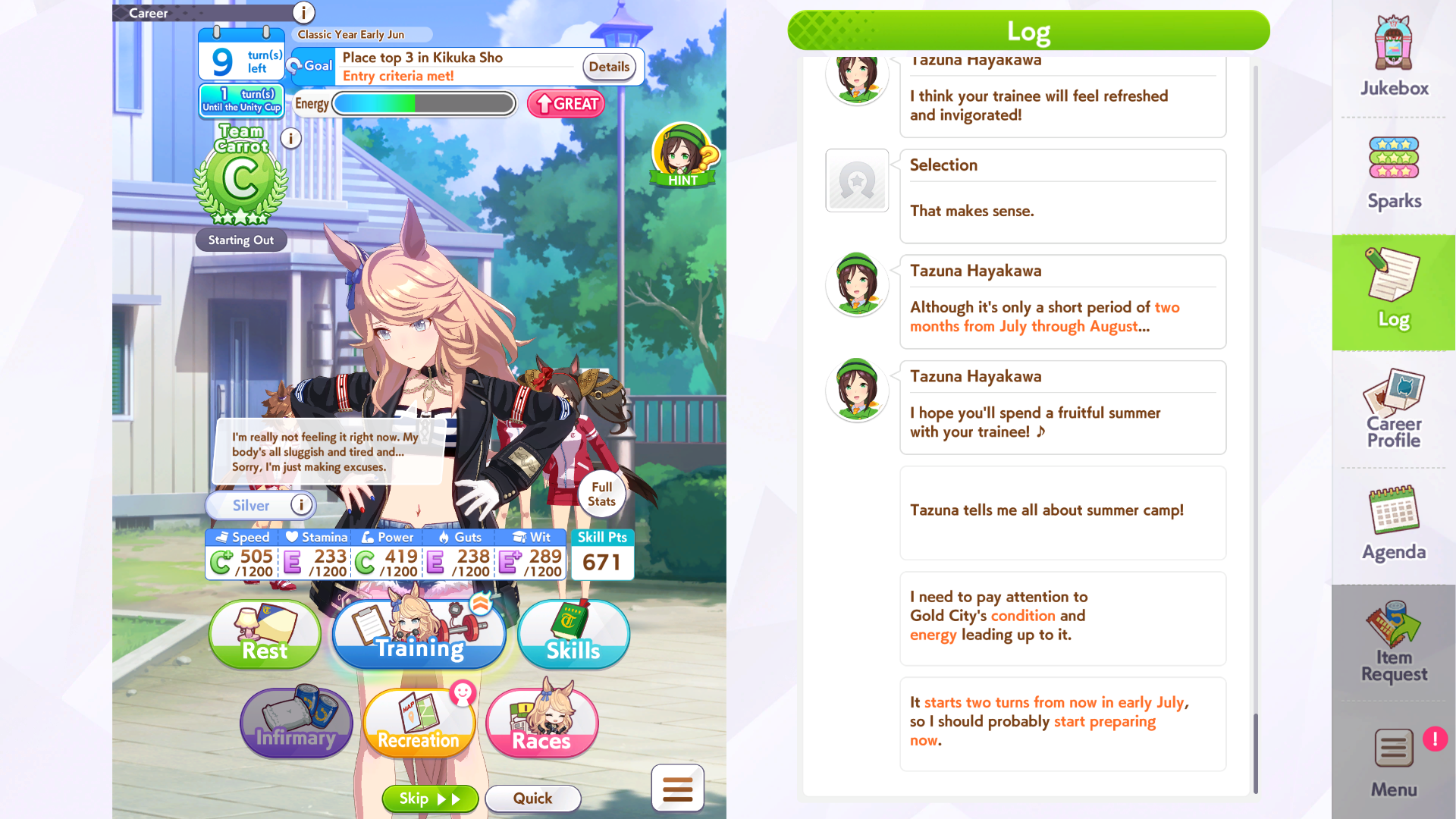 Сделал Огурю-электрика но статы как всегда не набираются в херовом ране, еще и с только двумя спид картами. Оно конечно если ран херовый то хоть пять ставь в колоду - всё-равно кап не наберёшь. Но вроде и не на столько херовый он был, чето даже выигрывала, отдых не на онли 30 правда на 70 всё-равно не увидел треню только одну проебала и сразу вылечилась после неё. Но энергии всё-равно не было, а рисковать 60+% провала ради тренировок на +25 не хотелось, что б не добить и так не сильно идущий ран. В кои-то веки хоть скилов более-менее насыпало, я уже и забыл когда спид стар и курватуру в одном ране видел.