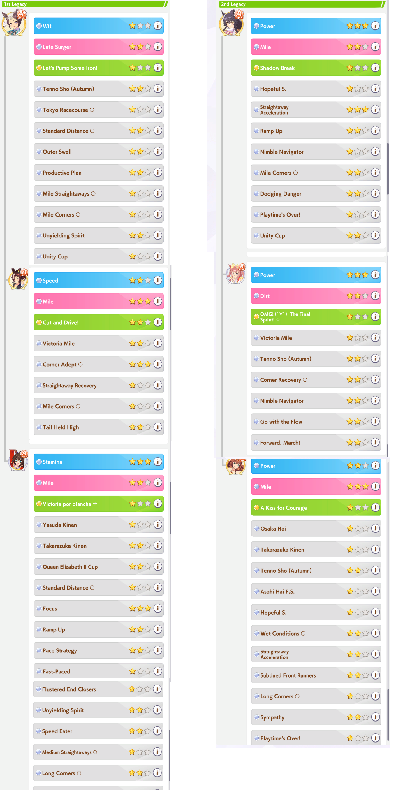 >>6485842 >>6485854 Так, ну, я бы сказал что даже в обычном чм можешь в группе б пободаться. Под опен сойдет спид-пава колода, но делать надо в ура финал, а не в юнити кап. Из ум берешь дигитан, мару и кондора, но придеться помучаться с ними, зато результат будет интересный. В целом у всех твоя задача набить >900 и <1050 спид-пава, 500-600 стамины, 300-400 вит хотелось бы, но лучше не налегать. В конце тебе наливает 50 статов ВЕЗДЕ, это надо учитывать. Для большей впихуемости статов и скиллов ульту качать строго противопоказано, в карьере стараешься проходить первые гонки нарочито плохо, если не добиваешь какую-то цель по фанатам, то берешь гонку, которая даст минимально допустимое число фанатов. Если фанатов все равно выходит больше, чем надо для прокачки скилла (60к в феврале, 70к в апреле), то дружба с директоршей не должна быть зеленой. Под конец года <120к, если все правильно сделал и на первых двух ульта не качалась то и тут не должна. В конце залазишь в калькулятор в шапке, забиваешь статы, материшься если перелил. Если меньше 8200, то тыкаешь какие скиллы из ПОЛЕЗНЫХ УСКОРЕНИЙ С ГАРАНТ ПРОКОМ, желательно золотых, влезут, на все остальное даже внимание не обращаешь. Кроме зеленок на спид и паву, их можно если не лезут нормальные скиллы. В конце у тебя получается мутант с одним-двумя скиллами, который будет выигрывать только потому, что спида больше, чем у противников. По конкретным умам: дигитан так и остается, ускорения посмотри из тех что есть на лейтов + белый скилл на навигацию из встроенных у нее, не помню как он. Кондор надо делать фронтом, это 10 спарков. Ищешь родителя сеюн скай с 7-9, добивать надо кем-то своим. Ей туда же надо добить грязь до А, это один спарк, в идеале сделать своего родителя если у тебя есть своя ума с фронт или дерт спарком, другого добираешь взаймы. Мару для тебя будет самая сложная в этом плане, но выхлоп будет очень хороший, тебе надо 7-9 спарков грязи и остальные забить спарками на энд клозера. Из ускорений берешь спурт, но основным ускорением будет ее ульта из позиции энд клозера. Если мару вообще никак потому что нету своих спарков на грязь, то делаешь маяно, 10 спарков на грязь, бегать фронтом, нужна ульта сеюн и кондор.