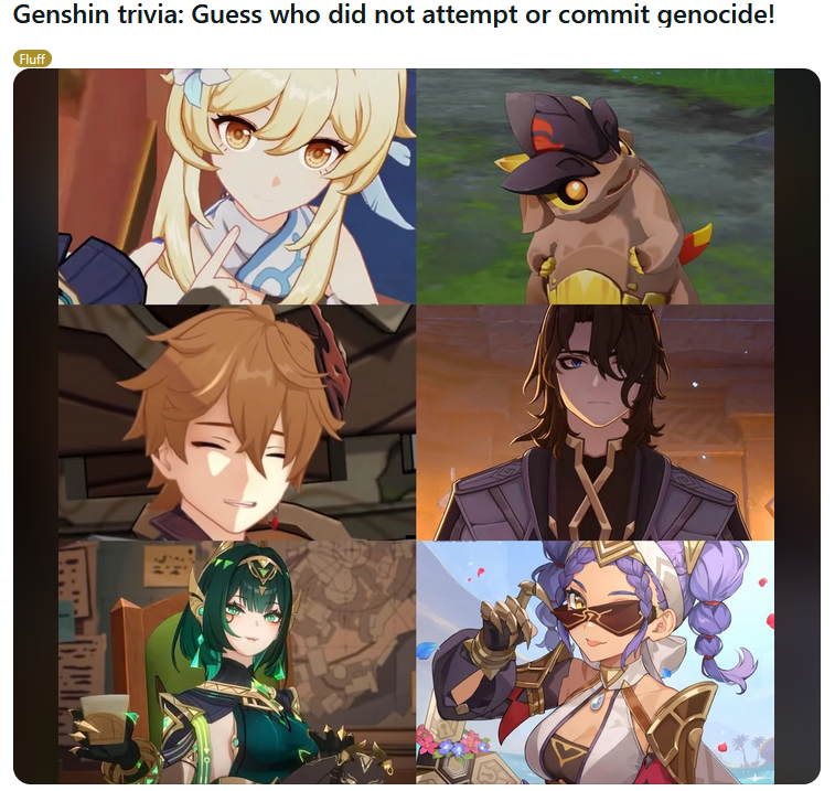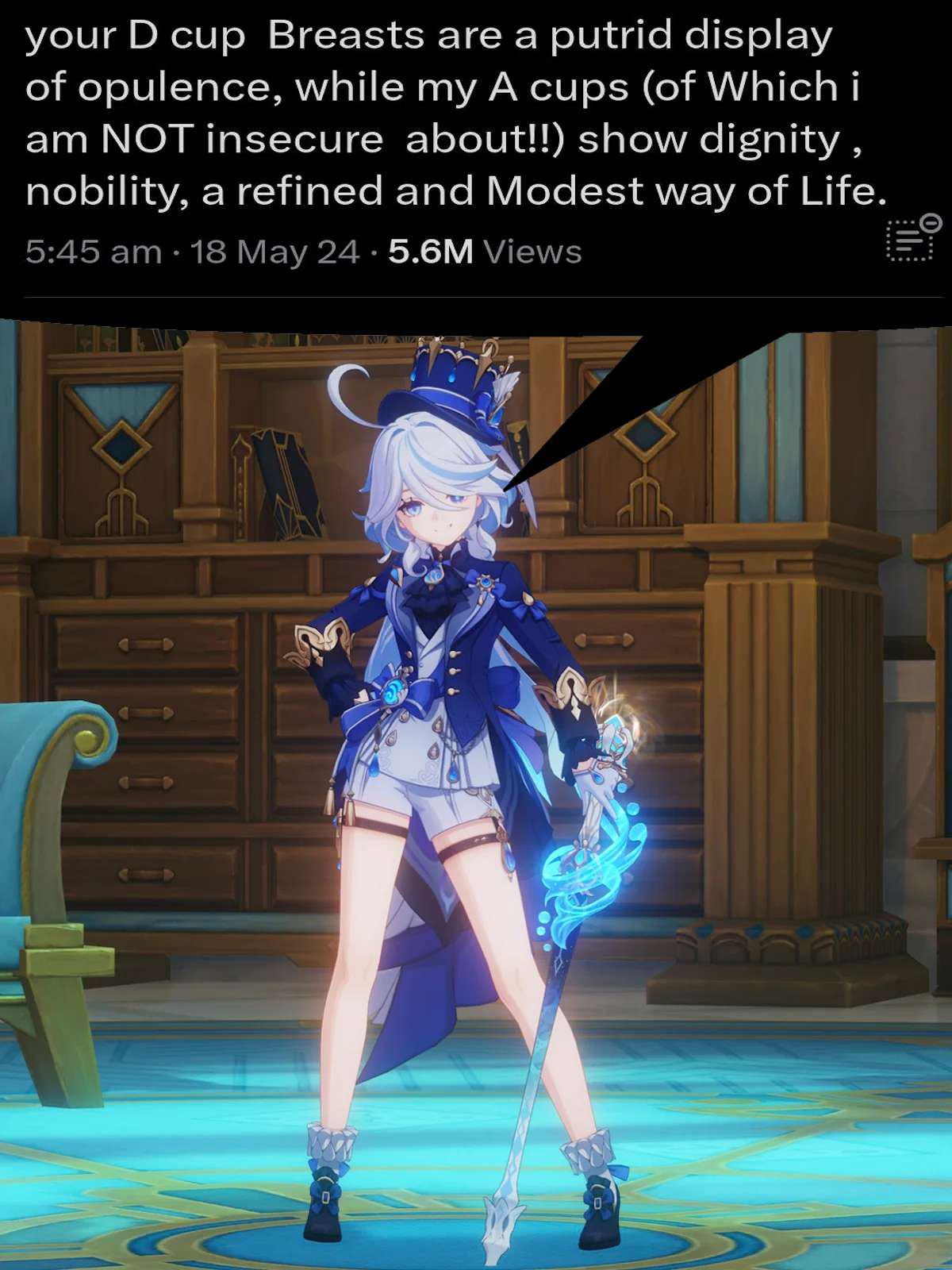 Классика ньюфага: сначала обосрать оппонента эпитетом "глупость", чтоб самоутвердиться, а потом сам же отвечаешь, потому что без этого твой пост - пустышка. Если реально не знал, нахуя постить? Это не аргумент, а дешевая поза для морального превосходства, типичная для тех, кто в лоре Genshin видит глубокий психологизм, а не фан-сервис.