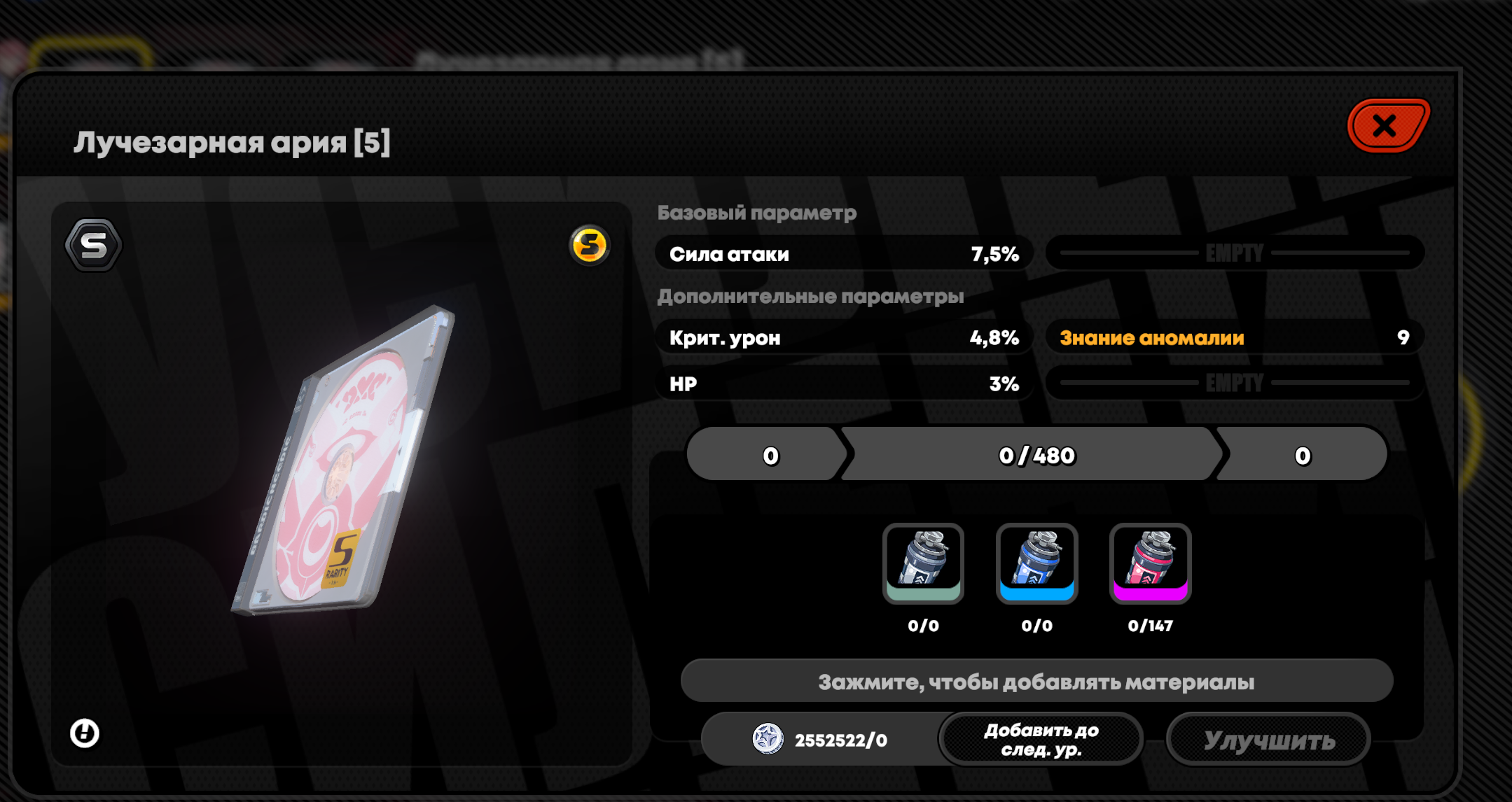1к золотых дисков. Чето маловато атаки вродею Калибратор на 6й слот не тратил, так как у меня 6 штук фейтон мелоди 6%атк 18ап, шанс получить апгрейд примерно 1%.