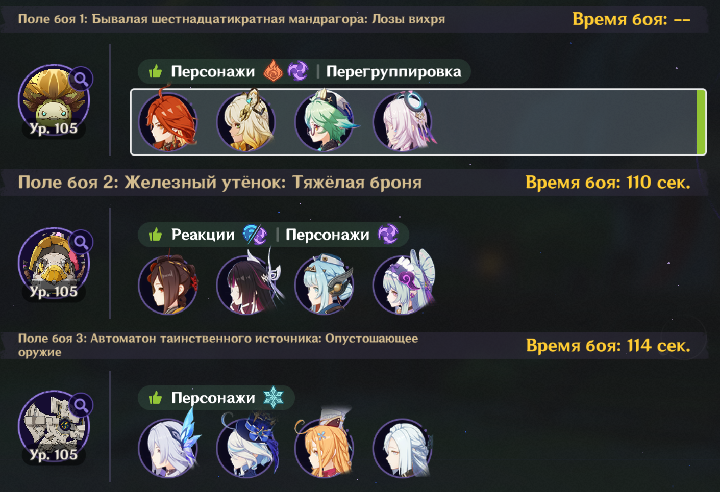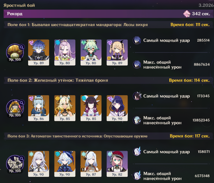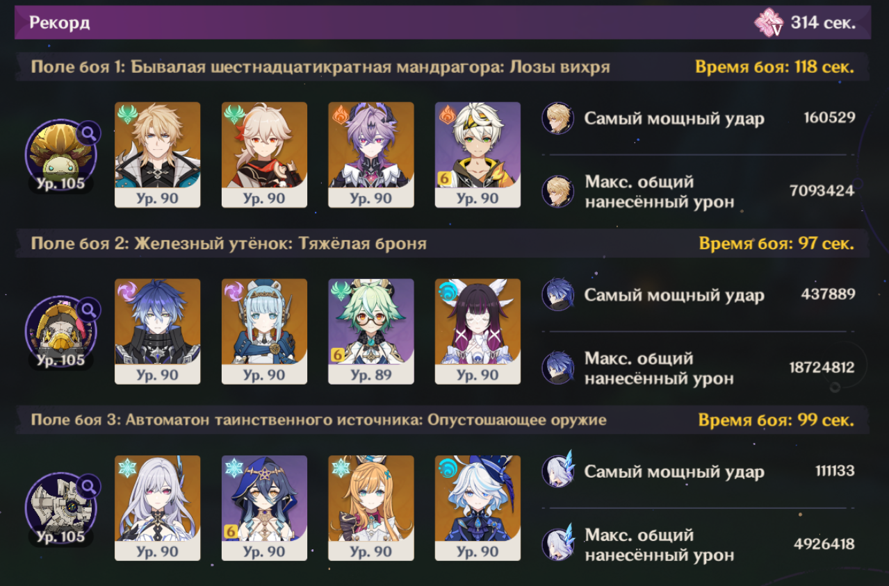 Посмотрел на пикрилах как многие проходят на лучший таймер чем у меня. Видимо че то не так делаю Ульта венти всегда красится в пиро тк Мявуика срет из кармана. Как то надо сделать чтоб в крио пошла инфузия Еще крио робота проходят быстрее. Вот тут хз где можно выиграть время, у скирк прямолинейная ротация