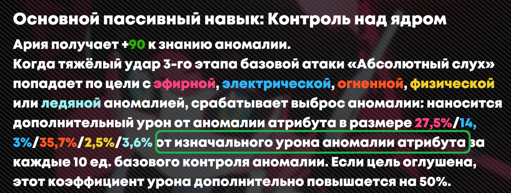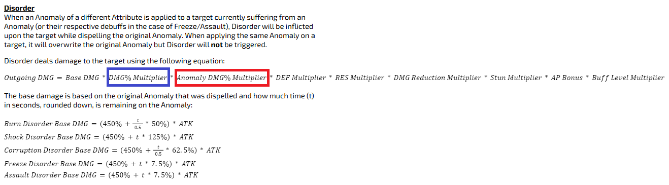 Насколько я понимаю, тут имеется ввиду, что прибавка идет не в обычный множитель (элементального) урона - DMG%, а в другой мультипликатор, который именно аномальный - Anomaly DMG%. Отметил красным.