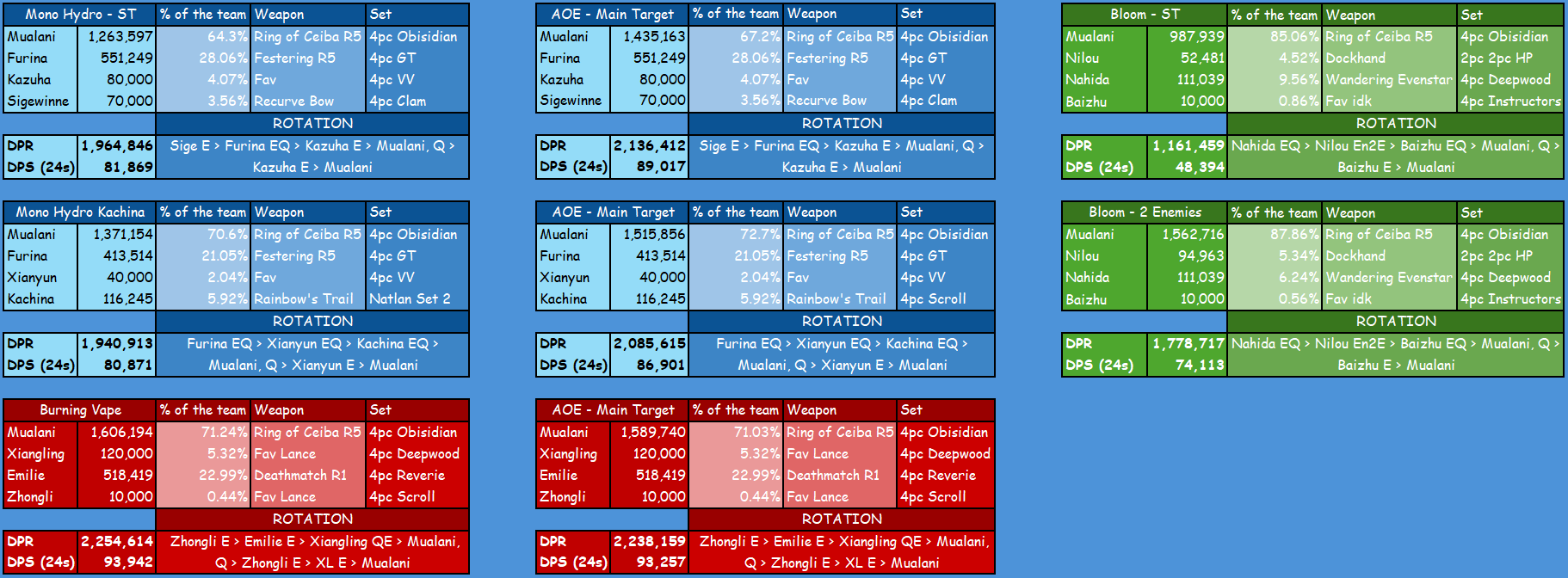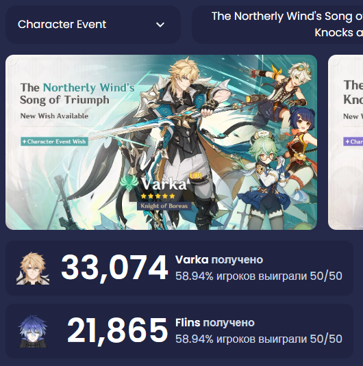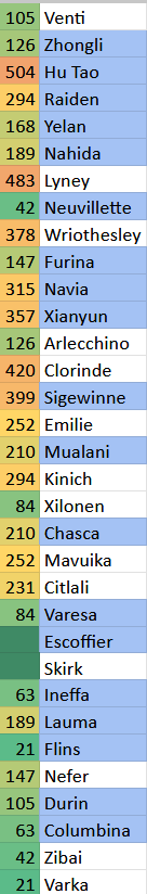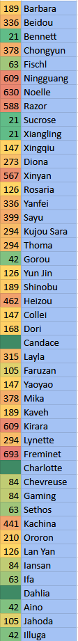 Текущая ситуация по ожиданию реранов. Цифра - количество дней, прошедших с момента последнего баннера персонажа, на момент окончания патча 6.4. Персонажи, бывшие в хрониках, не включены в список.