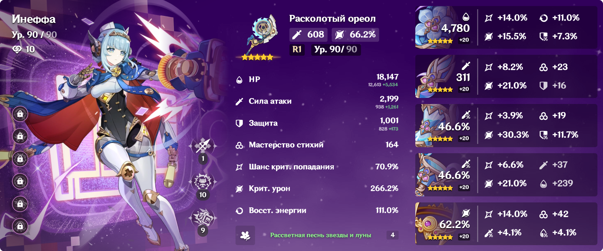 Защитная Луна: Когда активный персонаж под защитой щита наносит урон врагу, в месте нахождения врага высвобождается ударная волна, наносящая чистый урон. Этот эффект может срабатывать не чаще одного раза в 3 секунды.