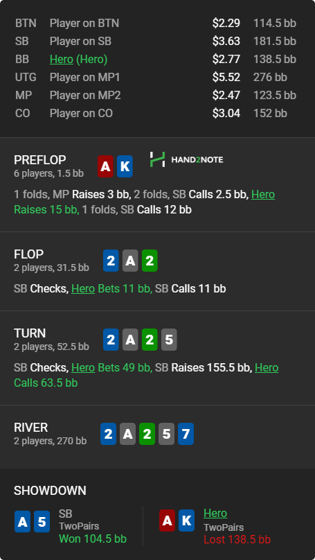 А вот ещё 2 раздачи, с которых пригорело, в дипах начинается ебала эта с 5-6 бетами. Тут меня просто выдавили из банков, как кусок гавна! Хотя очевидно, что если опп макака, то у него явно не одни ракеты в ренже будут, но бля очково зарубаться просто с АК разноцветными. Что делать пацаны в таких спотах, скажите.