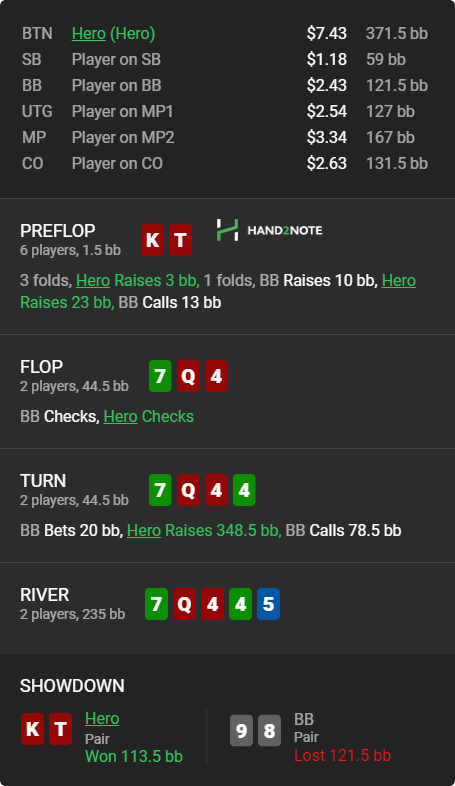 Тут показалось, что нелогичная линия розыгрыша: все AK должны быть в 4бете, часть KQo в блеф 4бете, остальные фолд, KJo фолдятся тоже. Остается 2 комбы KJs, а KQs не такие сильные, чтоб с ними плотно вельюбетить, не говорю уже про KTs. Зато переблефовать он мог вполне - с AQ, например и неплохо бы из прямо сейчас выбить, чтобы не дать доехать - показалось мне на терне и решил пушить или фолдить по рандомайзеру. Как видим на вскрытии, хиро опять обосрался (