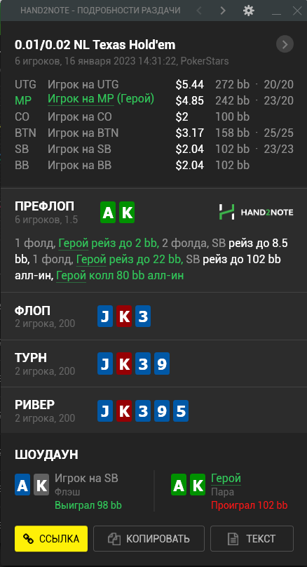 Пересмотрел ша раздачу и охуел что недобрал 4бб, походу мисскликнул и нажал треть пота вместо полпота, итого когда доехало - недобрал, недоехало - лишние 10бб въебал >>50085, пиздец короче, теряю винрейт за просто так.
