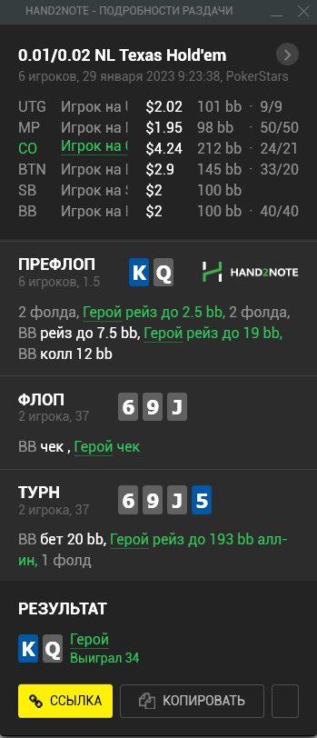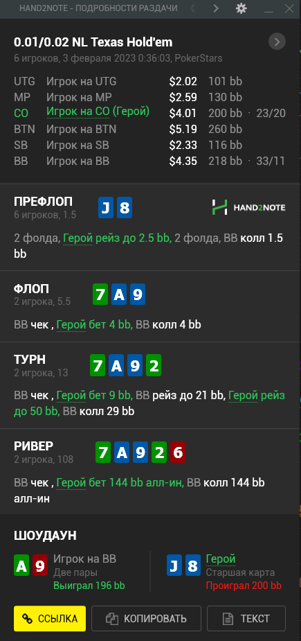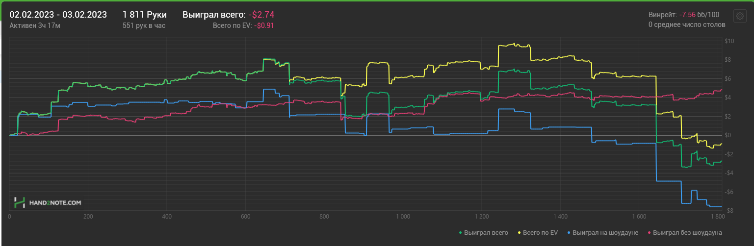 Доиграл кароче до талого - пока не поймал джек, но денёк всё равно в минусе из-за разрыва ev с реальным выигрышем. Плюс под конец аномальная хуйня, отметил стрелочкой, когда я с гавной по кд упирался в JJ+, а мои JJ+ вообще не проплачивались.