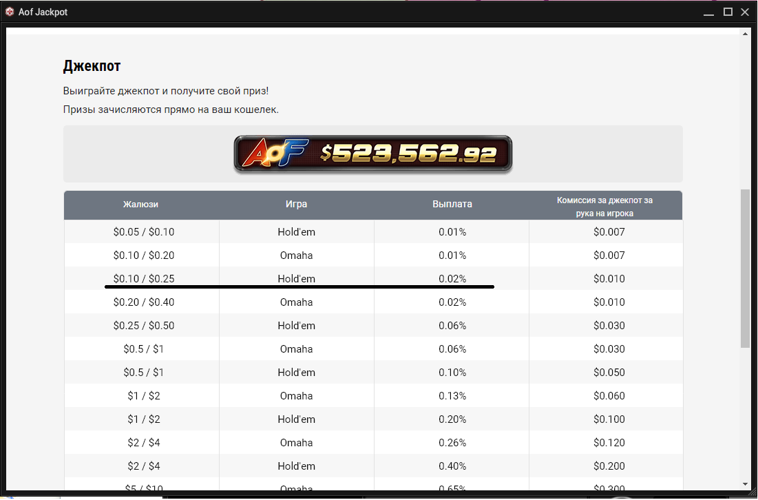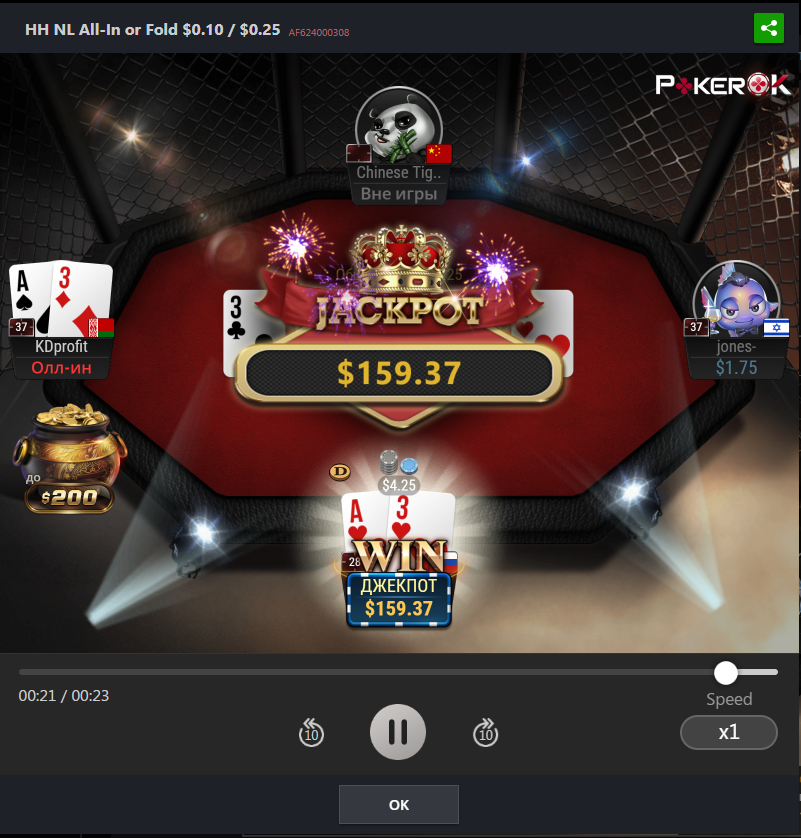 Лимит 0.1/0.25 Сыграно 118441 раздач с винрейтом 4.58/100 evbb. Собрано 14 джекпотов на сумму 2315.75 долларов.