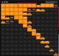 Адаптировал спектр >>50123 под себя, цифры в квадратиках это количество комб которое буду переповышать. Например: KQo - 5 рук из возможных 12, значит 3-бечу с шансом 5/12, то есть когда на рандомайзере выпадет >58