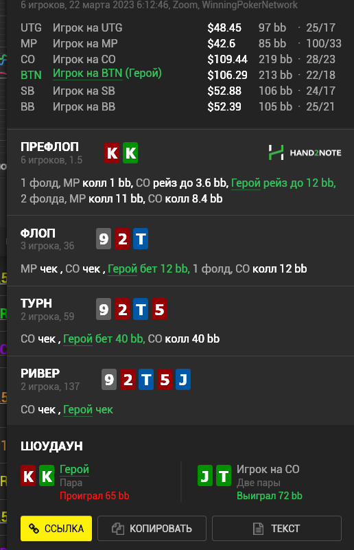 По кассе +356. За прошлые дни, начиная с 10 мая занимался теорией 8 часов. Думаю записать сессию, обсудить с тренером и пойти наконец разъебывать говнарей на нл100. Как никак зум50 за плечами. https://www.youtube.com/watch?v=LmsuxO5rfEU >>51037 с 44 однозначно ошибка. Я это написал в посте. С K5o я еще с чико не люблю таких нитовых фишей, играя с которыми ты плюсуешь чисто за счет красной. С ними даже труднее чем с регами, из-за их мании слоплеить все и вся, а когда рейз - туши свет. С KK тот диап, который ты ему накидал префлоп в целом такой же и на постфлопе остается(AK, QQ-AA). Вообще думаю твой вариант с пушем как раз лучше, потому что нитяра где-то лишний раз недоблефует с АК, где-то не вельюбетнет дамы, а тузы ему сыграть безошибочно не сложно. Просто бля, на 9макс столах такие и дамы коллить могут вс ЕП, что даже и не будет ошибкой в гто страте.