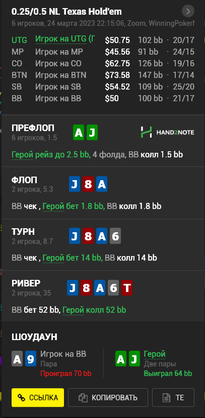 >>51113 77) Как мне подсказывает опыт, 9x на флопе очень редко рейзят, как и Ax. Во всяком случае на NL100 редстара. Есть конечно, но очень редко. Я бы давал сильное смещение в сторону блефов, бэкдоров и немного 5x, ну и натсы, конечно. И по тёрну дрова тоже редко в чек переводят, так что 76 и JT там вообще быть не должно на ривере. Просто вопрос чего там больше, сдач с мусором или хироколлов по Qx... От оппа зависит уже и поляны, мне кажется у нас часто бы можно было увидеть колл с Qx. AQs) Я таких помечаю, как агро-фиш, есть ещё нитовый фиш и просто дефолтный фиш. >В рейзе флопа могут быть карманки ниже 9х, 9х из рук лучше Это по нотсам? Я очень редко от фишей вижу защиту рейзом с чем-то хуже ТП (ещё на спаренном флопе карманки могут быть). Скорее поверю в рандомный мусор против твоих 1/3 на дровяной доске. Если так, то донк имеет смысл, просто чтобы горы мусора выбить и не дать себя выблефовать. Тогда согласен с раздачей, как сыграно, но! Колл флопа для меня всё ещё сомнителен, уж слишком часто выйдет плохой тёрн и нам придётся сдаваться. Или ты заранее планировал очень часто донкать? Как вообще эта линия у тебя против фишей? Часто юзаешь? >>51114 Не было такого бага у меня, хотя я иногда так и делаю, сначала пикча, потом пишу долго. Но вообще, я всегда, по привычке, сохраняю в буфер текст, прежде, чем отправлять длиннопосты.