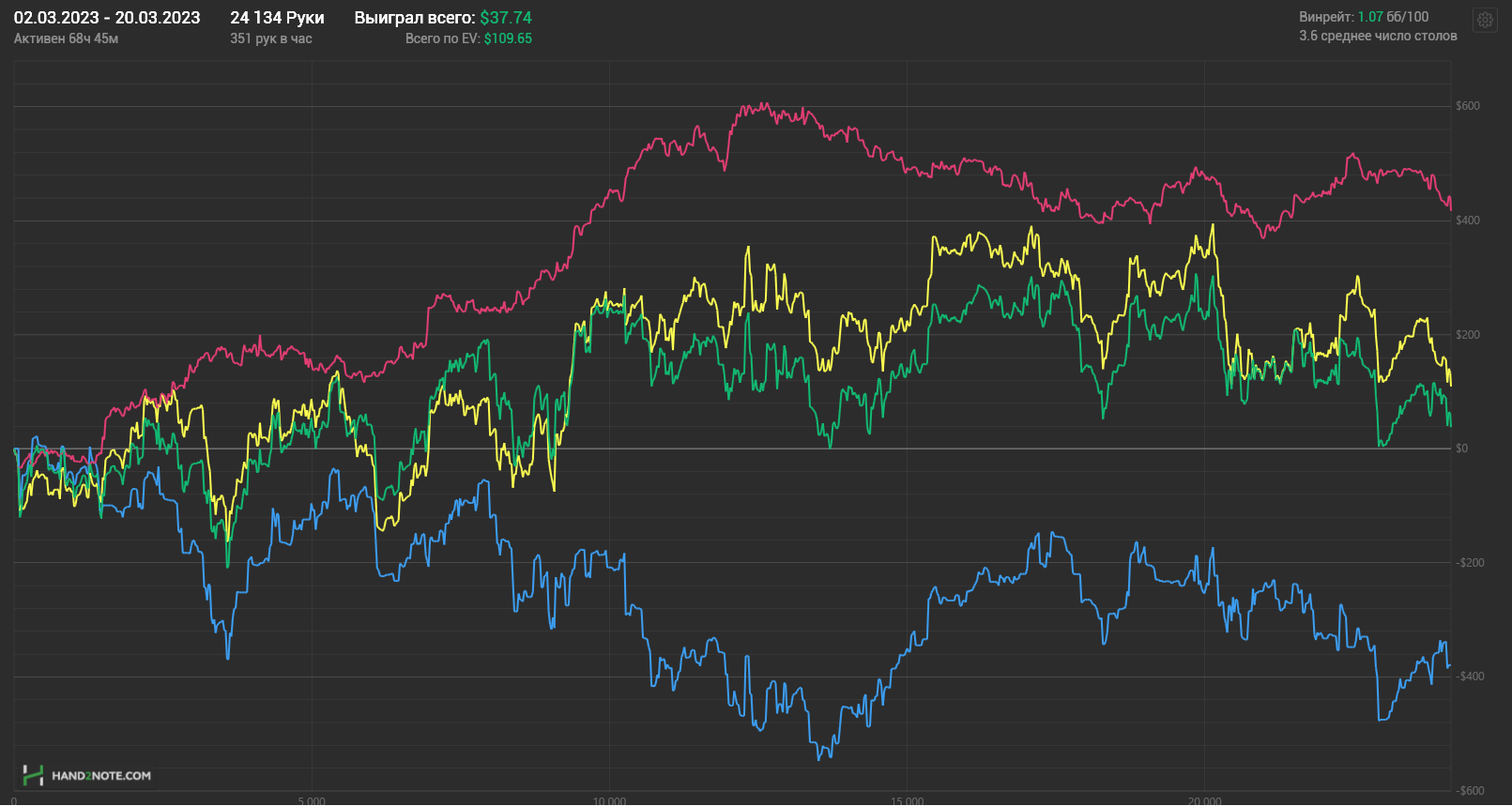 Начинаю увеличивать количество рук и столов, но ко 2 часу игры оперативки в мозгу пока не хватает. А потом поел, посмотрел тредик на дваче и уже спать хочется, потому что 3 день подряд пытаешься восстановить режим. Хотел 2 сессии, вышла одна, завтра будет лучше! А вообще есть ощущение, что я конечно селекчу пока что в никуда, на чико в первые дни так же было. По кассе +44 https://youtu.be/-I85HZlVvx4