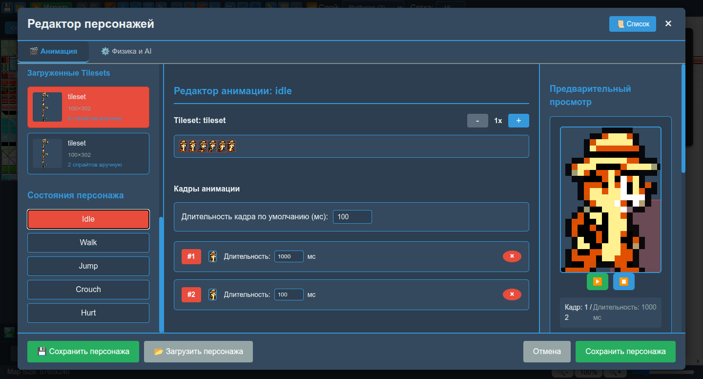 На данный момент сделал: - редактор уровней, где можно рисовать уровни из тайлов и ставить платформы, - редактор персонажей, в котором можно задавать анимации и коллайдер столкновений. - движок на основе Phaser 3, в котором это всё работает.