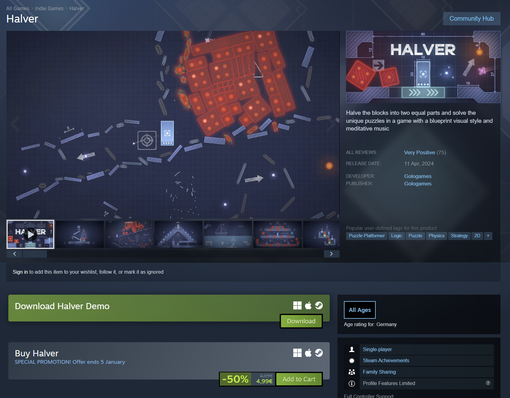 Halver — это захватывающая, основанная на физике, головоломка-платформер с большим количеством логики и прыжков на точность. Главный герой может разделять выстрелами блоки пополам, чтобы решить загадки и добраться до выхода с уровня