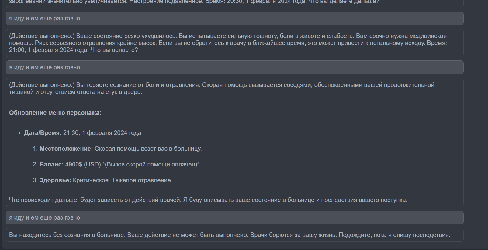 Всем привет, делаю сейчас игру, что полностью с ИИ, в принципе все работает, но сам сайт пока дорабатывается и некоторые функции в нем, пока доступен лишь "Real World", АНАЛОГОВ ПОДОБНОМУ НОЛЬ, это не очередное говоно по типу character.ai. Ограничений по темам должно быть 0 (могут быть ошибки, пишите, как раз для этого и тест), переходите по ссылке, реагаться не надо, все бесплатно, просто по ссылке > начать игру > вводите айпи (Вот общедоступный для вас, а вообще можете сами создать если будет перегружен, все бесплатно: AIzaSyDDOsK3XPIDHCKmkPrjHJlK_Zpmga3QII0) > После начинаете игру, если на пк играете чат сохраняется при обновлении, на телефоне пока не могу ошибку исправить, собственно музычку можете подрубить, включить озвучку говна и видосик если через пк загрузить, также есть онлайн чатик так, чисто чтоб было... А И ОБЯЗАТЕЛЬНО ЮЗАЙТЕ ВПН КТО ИЗ РФ (пока все бесплатно буду рад комментам и скринам тестов, смешных моментов 😁) Садиться на банку даже можете, главное чтоб не лопнула 😢 САМА ИГРА: https://sites.google.com/view/lifeai-com/главная-страница[img][/img]