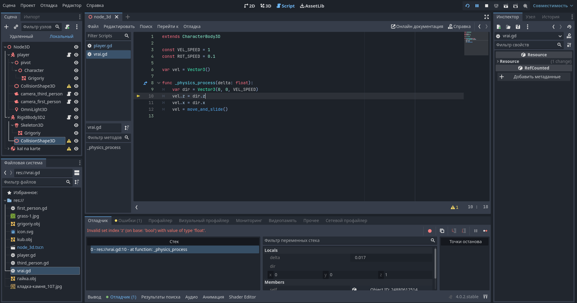 >>879165 (OP) ты пытаешься в обьект вектор засунуть свою хуйню и даже не удосужился прочитать документацию, даун ты должен передавать три числа в типе вектор. или по одному числу, но тогда надо писать x, y, z через точку. а move_and_slide у тебя вообще логического типа. а потом удивляемся почему дауны клепают такие говно-игры, в дворники лучше иди, там вообще думать не надо