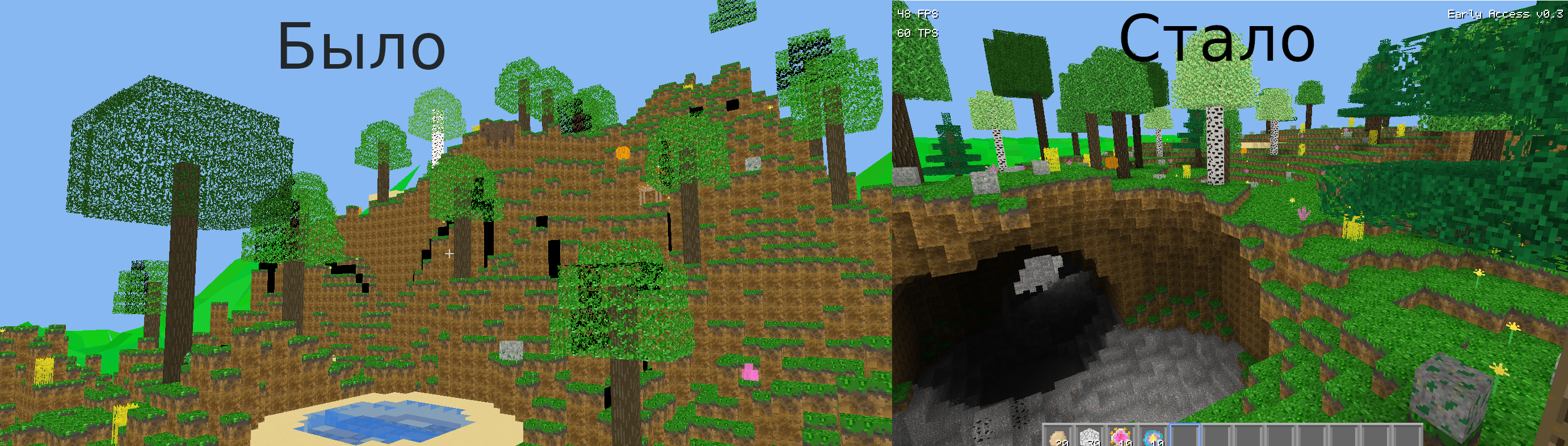 Последние 2 месяца я зачем-то переписывал старый код, в итоге добавил багов, вместо их исправления. Проект пишу на C, но планирую перейти на C++, чтобы юзать темплейты, а то неудобно бойлерблейтить аппендинг итемов в "списки". Используемые движки: SDL2, OpenAL, libccd. Использую OpenGL для отрисовки, из-за чего у меня прозрачности просматриваются сквозь чанки, а рисовать собственно их в 60 FPS можно только на топовых игровых компах. Может быть перейду на Ogre3D, но сначала его надо попробовать.