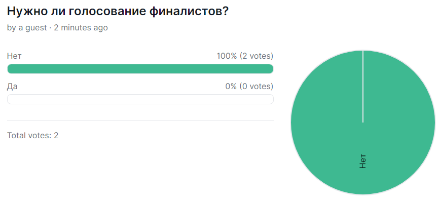 Предлагаю, помимо официальных итогов, сделать голосование участников и свободное для всех. Эти два голосования ни на что не влияют в распределении призов. Голосование участников - это дело ОПа, ибо у него почты участников. А свободное - просто любой может сделать голосовалку, вдруг тут не только участники сидят. Свободное конечно легко накрутить, но влияния на итоги нет - так что без разницы.