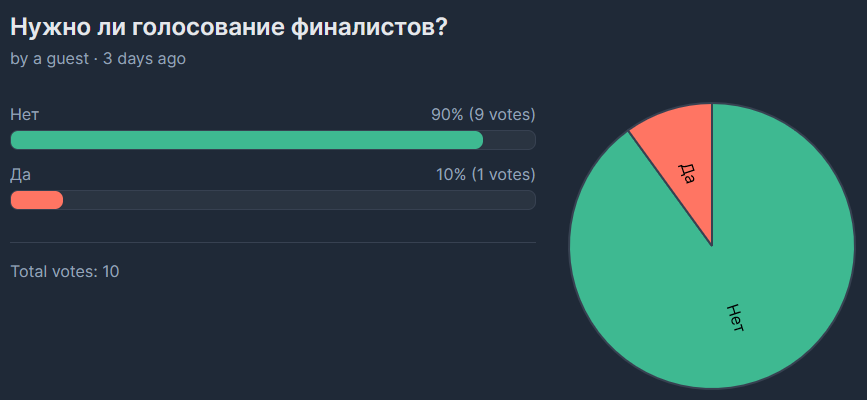 Голосование игроков нинужно. Во-первых лень голосовать. Во-вторых нахуя вам мой голос, если я чужие финалки по скриншотам и стримам оцениваю. Уверен, что вы делаете также.