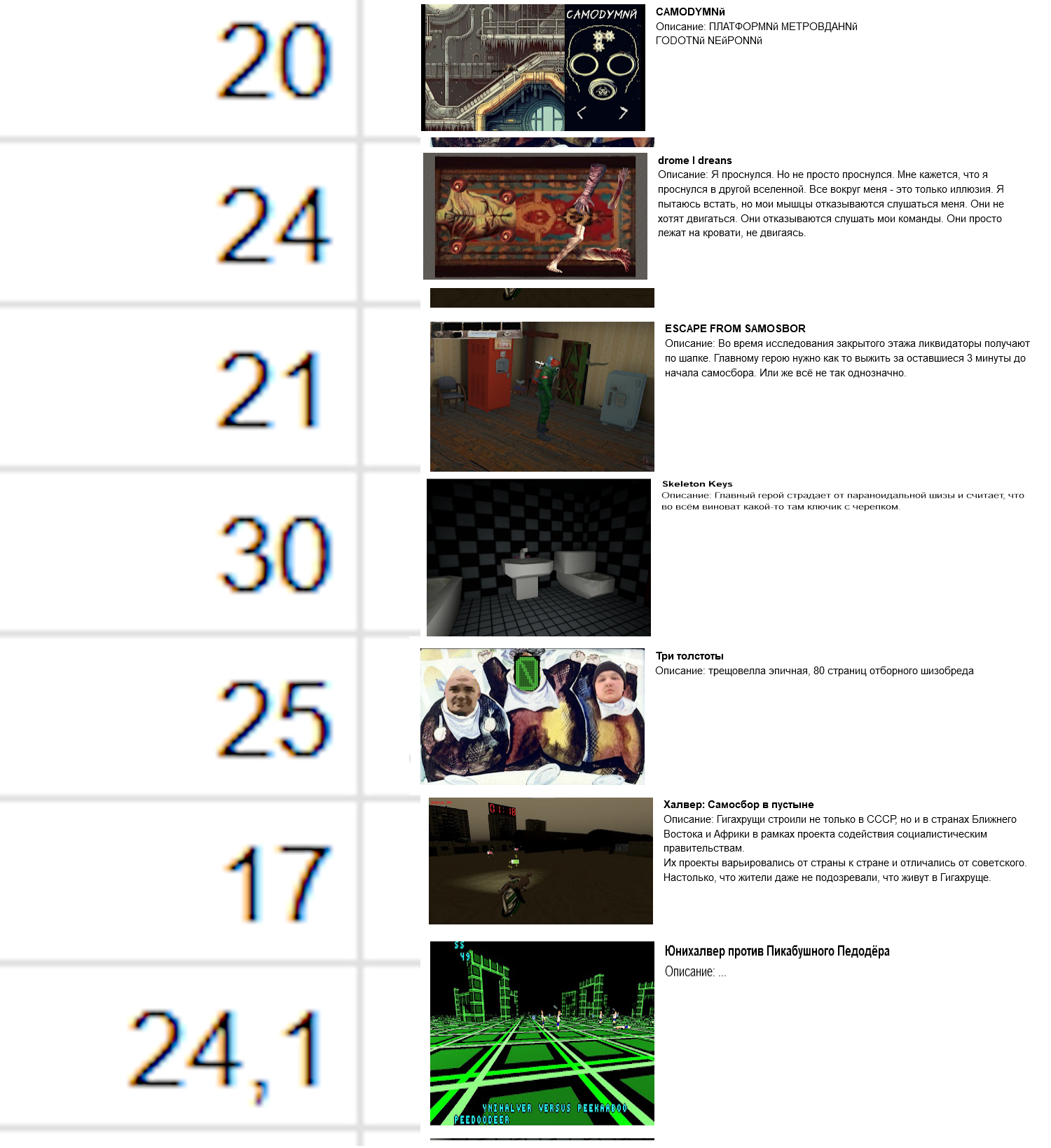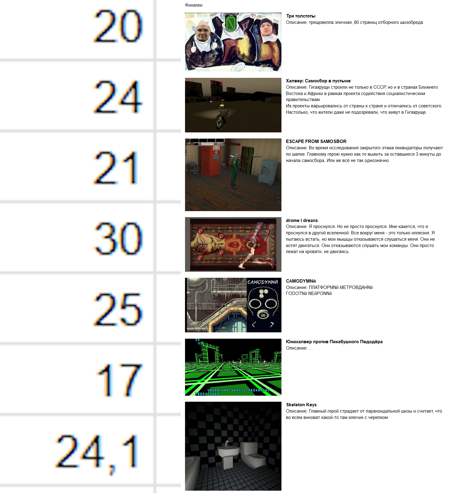 >>921582 Ну хз, по-моему сходится. Игра распидора на последнем месте, флешеслав на предпоследнем. И дальше более-менее похоже на правду. А если по алфавиту, то распидор взял третье место, лол. Может быть, конечно, еще какой-нибудь рандомный порядок, но не думаю.