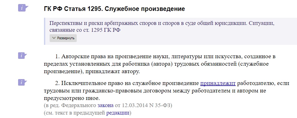 >>907406 >согласно 1255 ГК РФ Ты сам то читал этот ГК? Там написано "Автору". Осталось доказать, что наемный работник, у которого служебные обязанности "создавать шедевры" и в договоре написано о том, что все права принадлежат компании, может называть себя автором