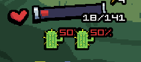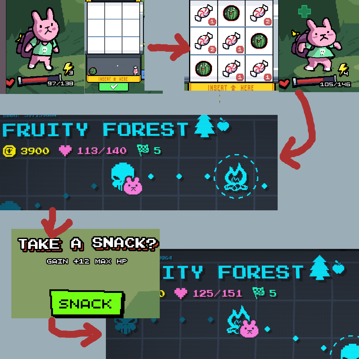 Произошел прогрев на конфеты. Итак у меня было 138 хп. Я зарядил конфеты против монстра с шансом 50%. Выпало конфет на +8 хп, макс хп стало 146. Но после боя 6 макс хп срезалось, осталось 140.