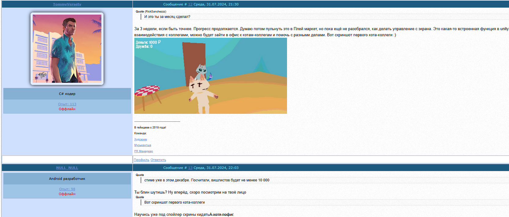 >>1002697 Как раз таки с мобилычами такие вопросы (по крайней мере раньше) не возникали. Идёшь к издателю, он вообще без вопросов кидает бесплатные деньги на рекламу, игроки играют в твою игру. Кроме циферок статистики, на ютубе даже появляются лестплеи от индусов всяких, а у игры накапливает 5-10 тысяч скачиваний даже если сделал хуету. А вот как на пк? Делаешь игру чуть лучше твг и куда её? Сколько человек бесплатно скачает твой exe, да ещё и запустит? Не говоря уже о том, чтобы увидеть реакцию игроков.