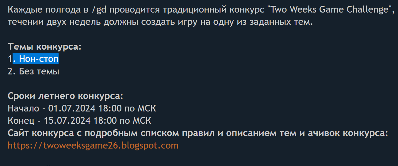 Попробовал сделать меню. Мало того, что получилась хуйня, так еще и уе крашнулся с жалобой на нехватку видеопамяти (это ему 16 гигов 4060ти не хватило, ага, в полупустом проекте). Не то чтобы там что-то суперсложное было. Просто мне уже лень воспроизводить все это заново. Лучше лягу спать пораньше перед ночной сменой. "Игру" отправил без меню. Тупо похуй уже, кто и каким образом будет это проходить. Без заготовок соваться на конкурс было ноль смысла.