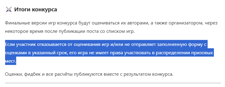 >>1002522 Хороший пункт, жаль я его сразу не прочёл. Ну, кстати, тут не указано, что оценки такой игры не влияют на положение других игр. То есть непроголосовавший всё ещё потенциально может быть первым, просто призовые места сместятся. В целом, так, наверное, даже лучше. У меня в мыслях было полное удаление из таблицы, чтобы не было влияния. В таком случае, оценки для фидбека, можно было бы оставить в отдельном json, если они будут интересны непроголосовавшим.