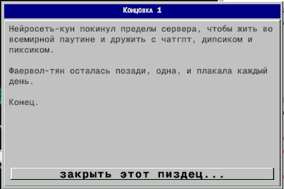 Капец я кринжа навалил в финальном диалоге конечно. Делал наспех и только на утро понял что это скорее не смешно, а глупо и быдловато. Благо до туда никто и не будет доходить