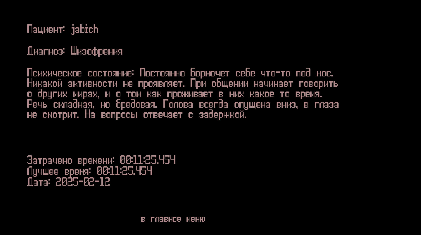 прошёл ТВГшки - Поиски Шизика ГД победитель? конечно под тему не оч подходит но самое масштабное из всех походу, про косяки нет смысла говорить, так как очевидно времени не было на фиксы и много всего и так сделано причём прошёл почти одновременно с кисаней и вылечил всем шизу в 0% перед финалом, скорее всего шизом в таком случае становится просто первый герой в массиве, у меня это был расп и шизом стал расп