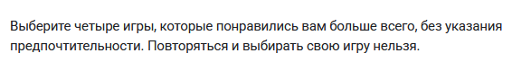 Так какая система оценивания то? Написано что форму можно заполнить только один раз, и считается только первая, при этом что в ней пока я не начну заполнять не увижу. Но зато упомянуто что я не могу выбрать свою игру. То есть надо выбирать игры? Я об этом должен телепатически узнать?