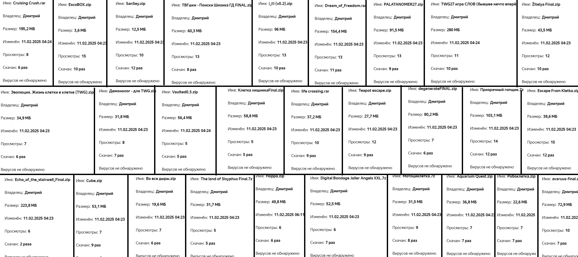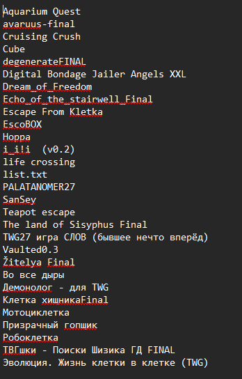 СПИСОК ИГР: Aquarium Quest avaruus-final Cruising Crush Cube degenerateFINAL Digital Bondage Jailer Angels XXL Dream_of_Freedom Echo_of_the_stairwell_Final Escape From Kletka EscoBOX Hoppa i_i!i (v0.2) life crossing PALATANOMER27 SanSey Teapot escape The land of Sisyphus Final TWG27 игра СЛОВ (бывшее нечто вперёд) Vaulted0.3 Žitelya Final Во все дыры Демонолог - для TWG Клетка хищникаFinal Мотоциклетка Призрачный гопщик Робоклетка ТВГшки - Поиски Шизика ГД FINAL Эволюция. Жизнь клетки в клетке (TWG)