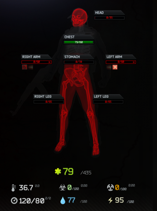понимаю, что странно узнавать состояние здоровья через инвентарь, логичнее было бы делать какое-то другое действие, как в том же таркове, но я не делал для этого отдельного действия и совместил оба также понимаю, что не хватает визуальных и звуковых эффектов наличия ранения, потому что не понимать, что тебя куда-то уже ударили это действительно странно, постараюсь добавить