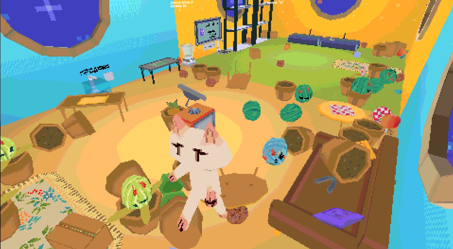 предмет, который берёшь в руку, наверное надо было прям чуток дальше поставить, либо отключить совмещение коллизий этого предмета и кота, когда несёшь его по прямой, то он втыкается в кота и мешает идти а один раз я взял горшок, он проскользнул под кота и как в скайриме на ведре подлетел под потолок, приходится бочком идти, хотя это нельзя назвать недочётом, тут как будто так всё и задумано